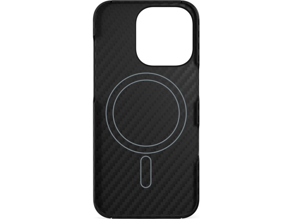 Kryt na telefon, pro Apple iPhone 16 Pro Max, kompatibilní s MagSafe, materiál aramidové vlákno, hliníkový rámeček kolem objektivů, barva černá.