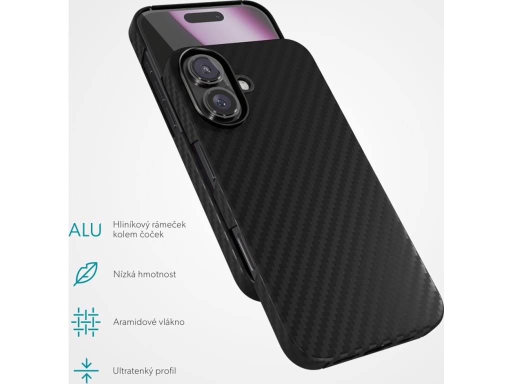Kryt na telefon, pro Apple iPhone 16 Plus, kompatibilní s MagSafe, materiál aramidové vlákno, hliníkový rámeček kolem objektivů, barva černá.
