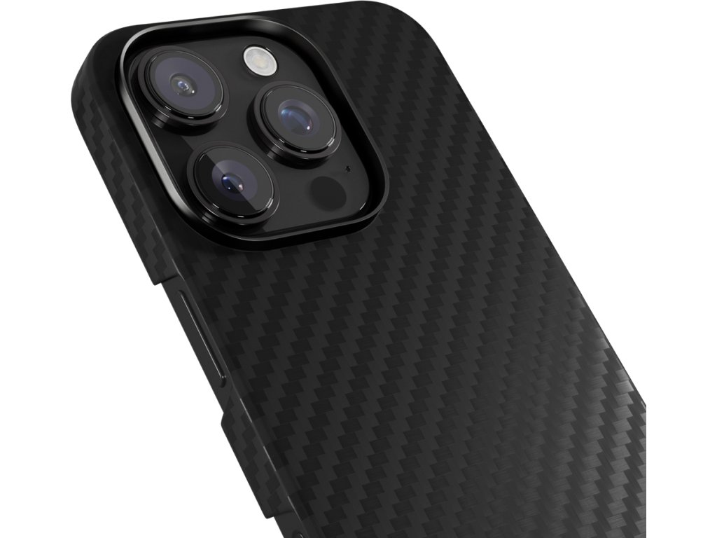 Kryt na telefon, pro Apple iPhone 16 Pro, kompatibilní s MagSafe, materiál aramidové vlákno, hliníkový rámeček kolem objektivů, barva černá.