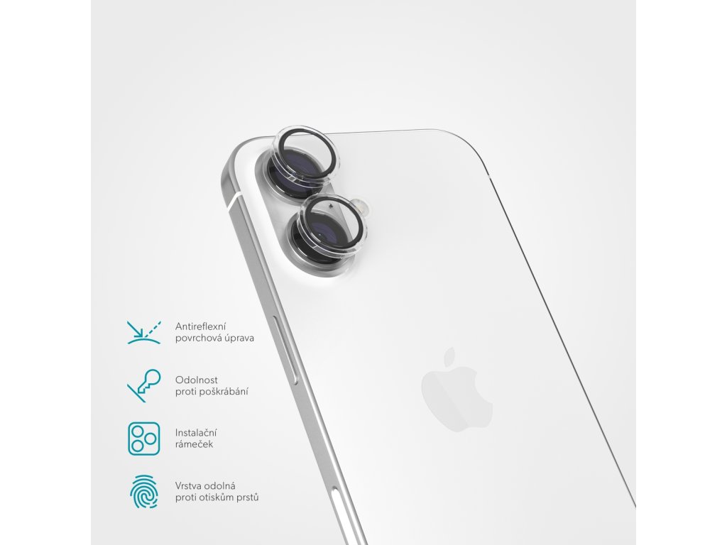 Ochrana pro čočky fotoaparátu, pro Apple iPhone 16/16 Plus, tvrzené sklo, tvrdost 9H, součástí: instalační rámeček.