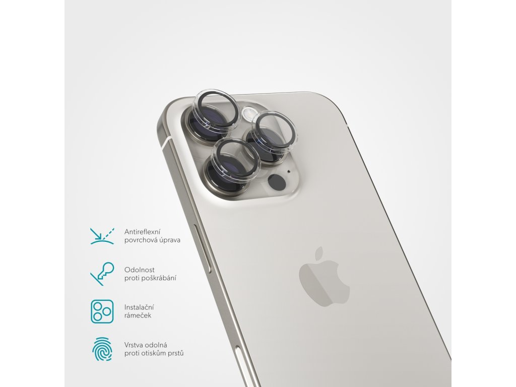 Ochrana pro čočky fotoaparátu, pro Apple iPhone 16 Pro/16 Pro Max, tvrzené sklo, tvrdost 9H, součástí: instalační rámeček.