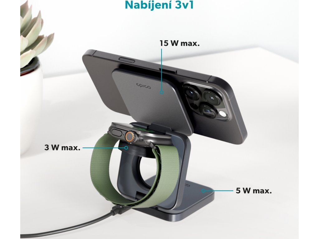 Kompaktní cestovní nabíječka pro všechna vaše zařízení Kompatibilita s MagSafe a Qi2: Bezpečné magnetické připojení pro pohodlné bezdrátové nabíjení.15W bezdrátový výstup: Poskytuje až 15W bezdrátové nabíjení pro kompatibilní smartphony a 7,5W pro iPhony. 3v1 nabíjení: Nabíjejte současně smartphone, Apple Watch (3W) i AirPods (5W). Skladný design: Ve složeném stavu nezabere skoro žádné místo ? perfektní na cesty i doma. Flexibilní umístění: Nastavte si obrazovku do ideálního úhlu ? na výšku nebo na šířku ? s režimem StandBy pro zobrazení času a oznámení. Protiskluzová silikonová základna: Udrží nabíječku pevně na místě. LED indikátor: Mějte přehled o stavu nabíjení na první pohled.