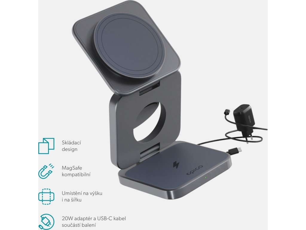 Bezdrátová nabíječka s podporou MagSafe, celkový výstup 23W, vstup USB-C, základna pro hodinky Apple Watch, základna pro AirPods, 1m kabel a adaptér součástí
