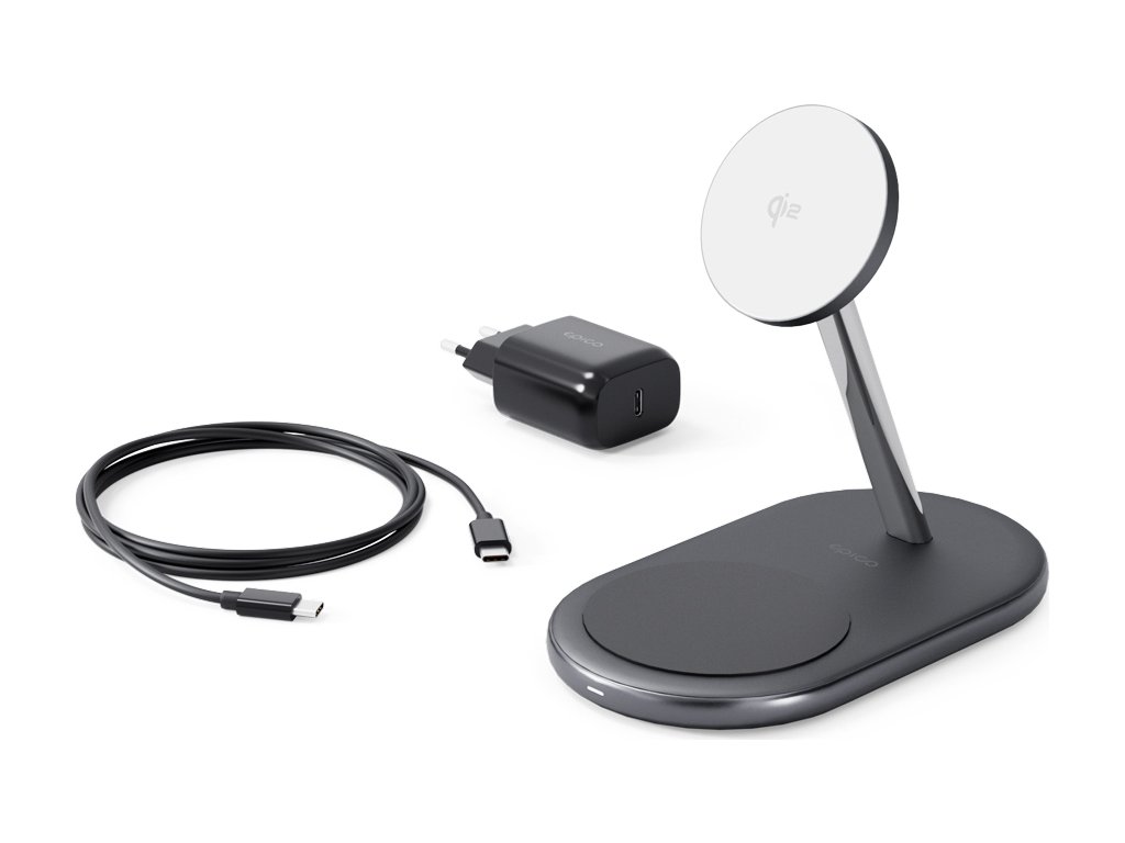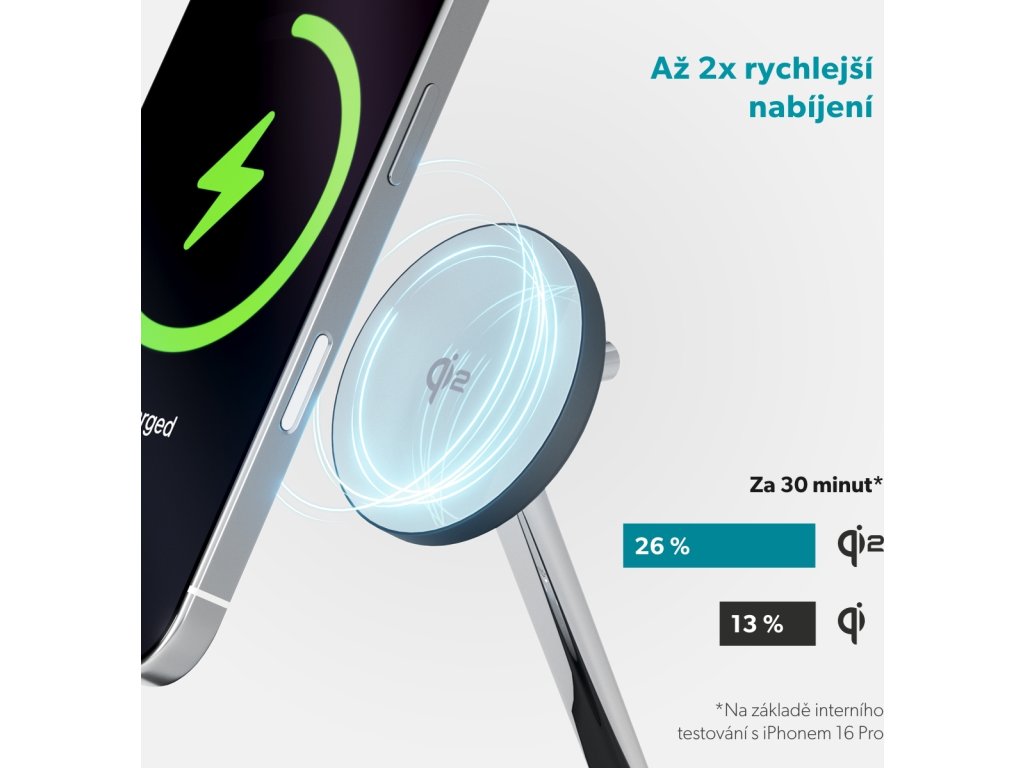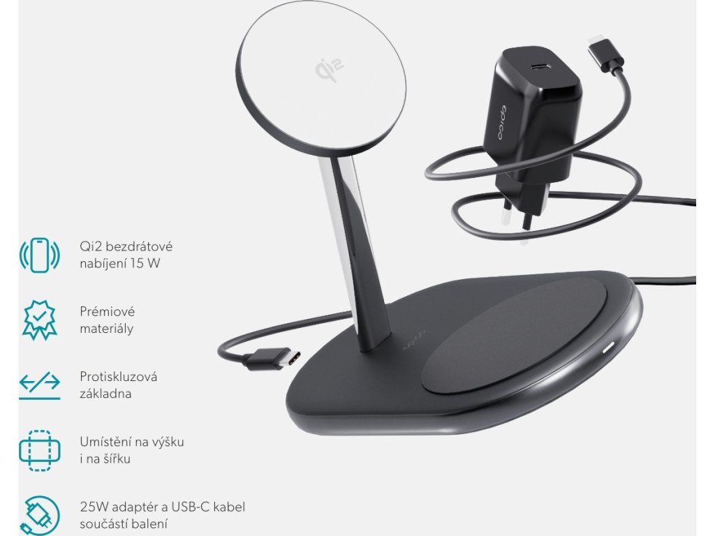 Bezproblémové nabíjení s propracovaným designem Elegantní design: Vyrobeno z prémiových materiálů, které z této nabíječky dělají krásný doplněk na váš stůl. Certifikace Qi2 & kompatibilita s MagSafe. Užijte si až 2x rychlejší bezdrátové Qi2 nabíjení pro iPhone (15W) s magnetickým uchycením. 2v1 nabíjení: Umožňuje současné nabíjení smartphonu a AirPods (5W). Stabilní gumová základna: Vybavena protiskluzovou gumovou základnou pro lepší stabilitu. Flexibilní umístění: Podporuje umístění smartphonu na výšku i na šířku.