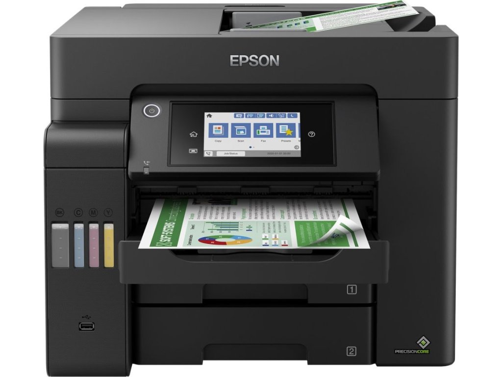 S touto snadno použitelnou tiskárnou EcoTank můžete tisknout, skenovat, kopírovat a faxovat dokumenty při opravdu výjimečně nízkých nákladech na jednu stránku. Veškeré úlohy lze zvládat rychle díky vysoké rychlosti tisku a skenování, dvěma předním zásobníkům na 250 listů, zadnímu podavači na 50 listů a automatickému podavači dokumentů o kapacitě 50 listů. Díky funkcím mobilního tisku, Ethernet připojení a dotykovému LCD displeji s úhlopříčkou 10,9 cm můžete tisknout tak, jak právě potřebujete.