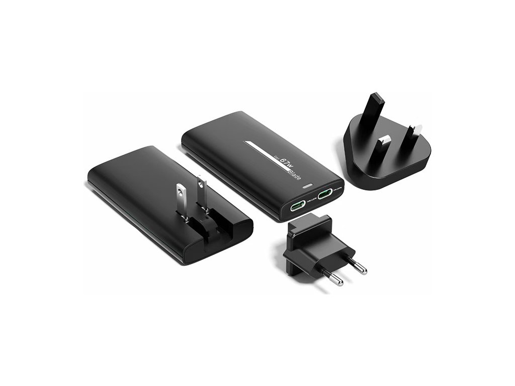 Nabíječka disponuje dvěma porty USB-C, v balení navíc naleznete vyměnitelné UK a EU vidlice, které v případě potřeby umístíte na US vidlici, která je v nabíječce integrována. Díky tomu máte možnost nabíjet dvě zařízení a to téměř kdekoliv na světě.