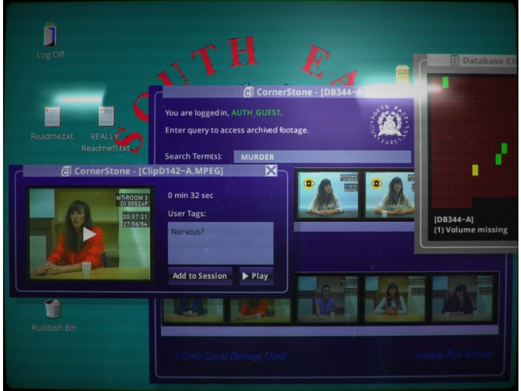 Her Story je hra vytvořená Samem Barlowem, designérem dvou dílů ze série SilentHill. V hlavní roli se objevuje žena jménem Hannah (Viva Seifert), která je celkem sedmkrát vyslýchána policií ohledně svého pohřešovaného a později zavražděného manžela Simona. Výslechy se odehrávajív roce 1994. Interaktivním prvkem je možnost hráče procházet policejní databázivyhledáváním frází a sledovat videa, kde tato slova z úst vyslýchané zazní. Postupně si tak skládáte dohromady příběh asnažíte se ve finále případ vyřešit. Vdatabázi najdete stovky krátkých klipů afilmečků. Na simulaci starého počítačejsou také k dispozici další vedlejší funkce jako např. minihra.