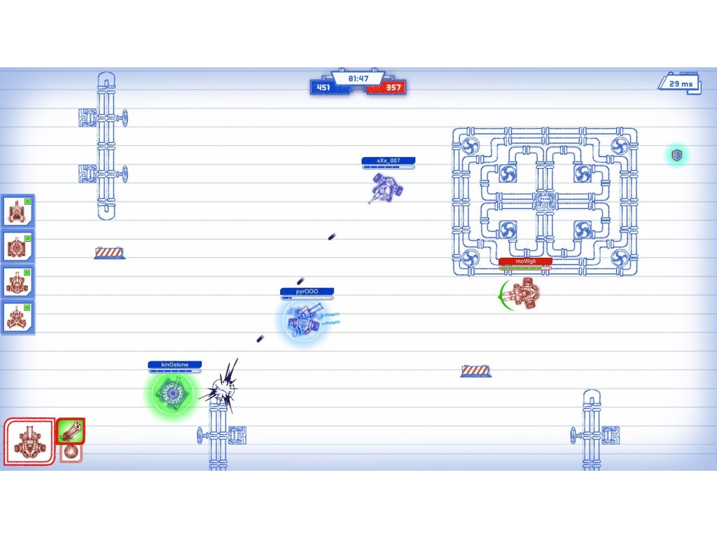 Každý tank má své unikátní primární a sekundární zbraňové útoky jako střely, EMP výbuchy, miny, kulomety atd., Nabízející různé útočné možnosti. Vyberte si tank, která vyhovuje vaší strategii, protože každá mapa bude jedinečná s power-upy,zničitelnými prvky, pohyblivými barikádami, portály, příkopy, dopravními pásy amnoho dalších, aby bitva byla vždy jedinečná a šílená!
