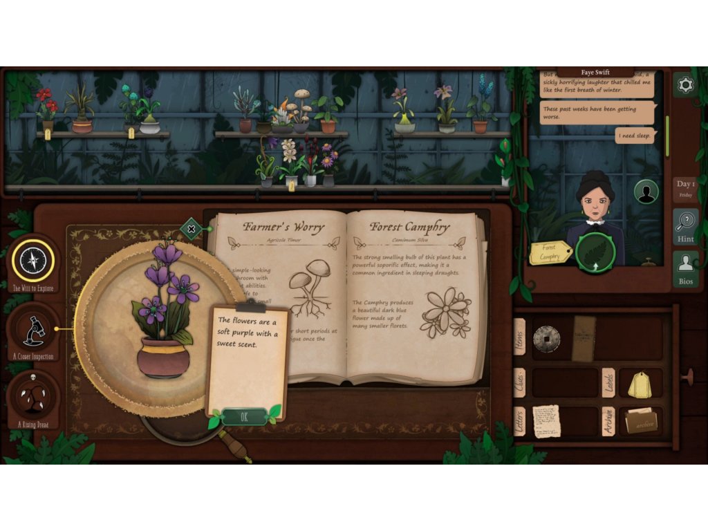 Hledej a identifikuj nové rostliny, hlaďsvého kocoura, promluv si s čarodějnicemi nebo se přidej ke kultu. Využij svourostoucí sbírku k ovlivnění příběhu a odhal temná tajemství Undermere.