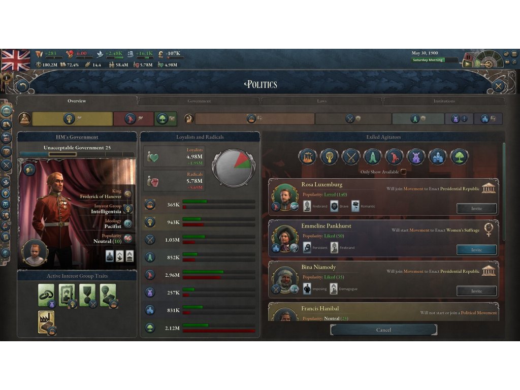 Nový systém agitátorů oživuje historii více než 60 novými postavami ze skutečného světa, které bojují za své přesvědčeníve vašem národě. Od ohnivého americkéhoabolicionisty Johna Browna přes německou socialistku Rosu Luxemburgovou až po odhodlaného italského národního buditeleGiuseppe Mazziniho - slavné historické postavy se mohou objevit ve vaší zemi, aby si vybudovaly vlastní mocenskou základnu a prosadily změny, které pomohou neboztíží vaše současné plány.