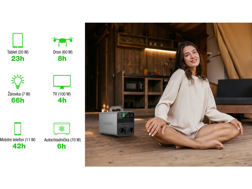 • Výdrž napájení spotřebiče: tablet (20 W) – 23 h, dron (60 W) – 8 h, mobilní telefon (11 W) – 42 h, žárovka (7 W) – 66 h, TV (100 W) – 4 h, autochladnička (70 W) - 6 h