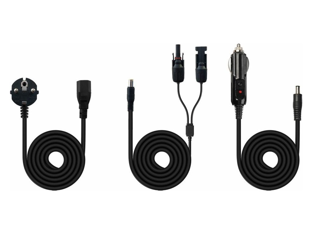Součástí balení je sada nabíjecích kabelů. Tato sada obsahuje síťový kabel, nabíjecí kabel do autozásuvky a solární dobíjecí kabel. Díky těmto kabelům budete moci pohodlně nabíjet svou nabíjecí stanici nejen ze zásuvky, ale také během jízdy autem nebo pomocí solárního panelu.