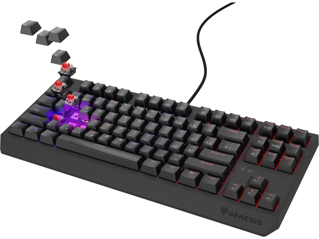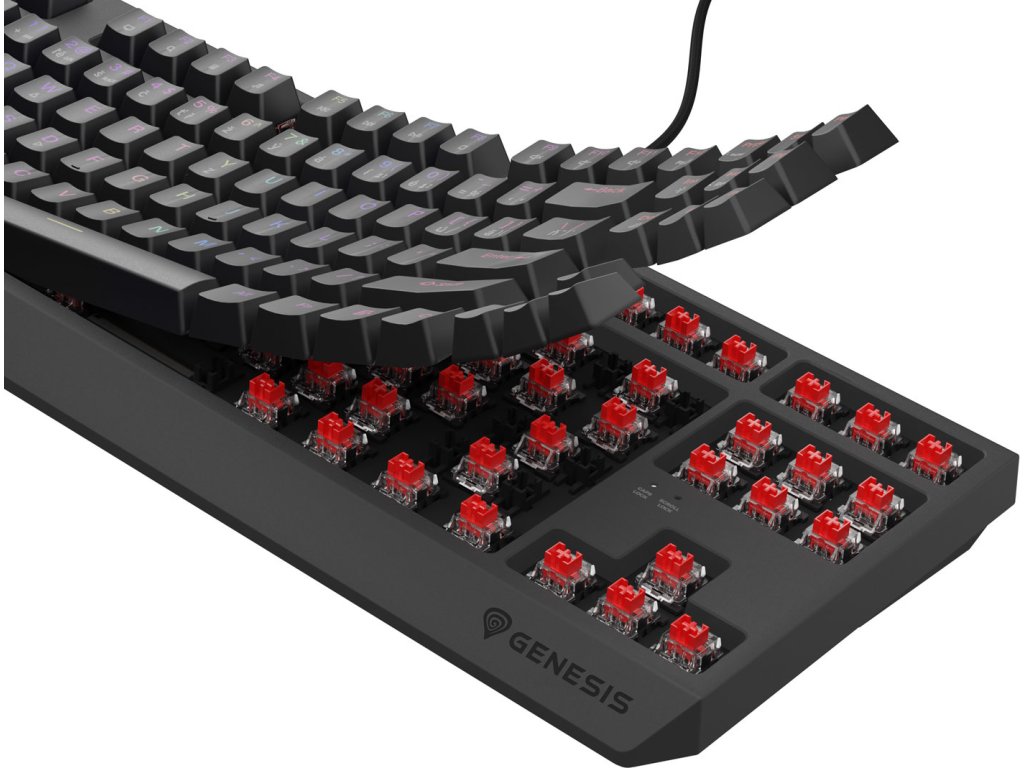 Klávesnici Genesis Thor 230 TKL jsme vybavili lineárními spínači Outemu Red, které vynikají vysokou přesností, aktivací bez ohledu na místo stisknutí klávesy a vysokou dynamikou. Víme však, že jako hráč můžete mít své vlastní preference. Proto jsme do Genesis Thor 230 TKL implementovali Hot Swap - techniku, která vám umožní nahradit jakýkoli třípinový mechanismus mikrospínačem od společností jako Outemu, Akko, KTT. Jednoduše vytáhněte nainstalovaný mechanismus a zapojte nový. Díky systému Hot Swap také nemusíte kupovat novou klávesnici, když jeden spínač selže. Vyměníte jej během několika sekund. Je to tak jednoduché.