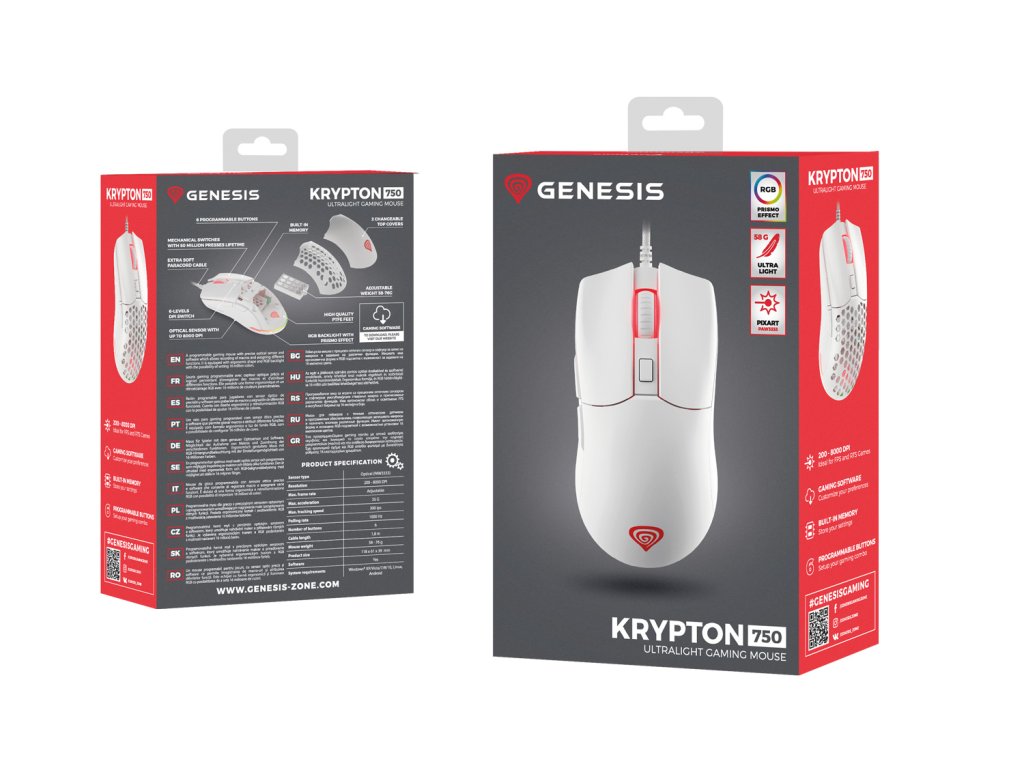 Genesis herní optická myš KRYPTON 750/RGB/8000 DPI/Herní/Optická/8 000 DPI/Drátová USB/Bílá