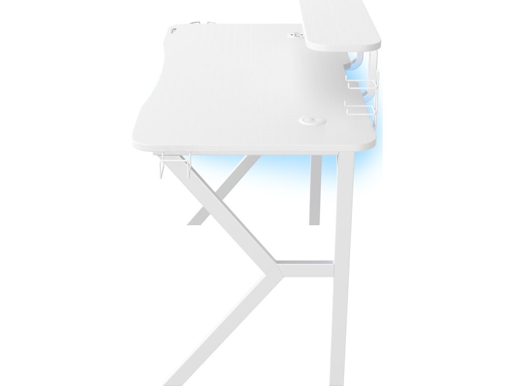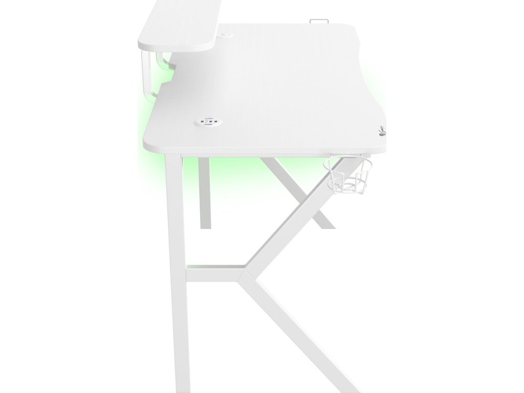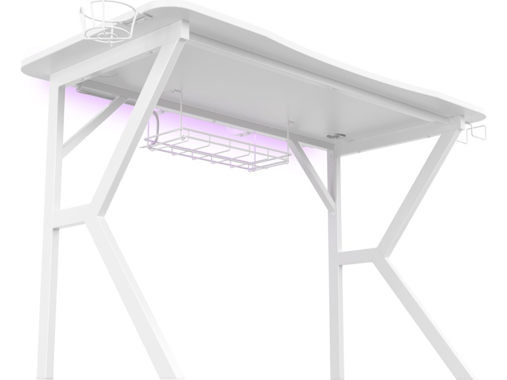 Každý prvek stolu je vyroben v bílé barvě. Karbonová povrchová úprava desky stolu v kombinaci s fenomenálním RGB podsvícením vám umožní vytvořit jedinečnou herní stanici. Přiložený dálkový ovladač vám umožní ovládat četné režimy a efekty podle vašich preferencí.