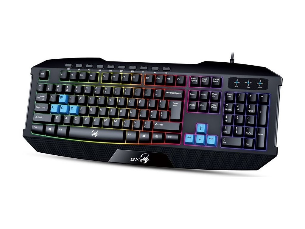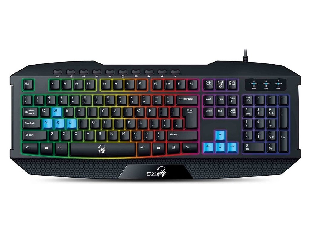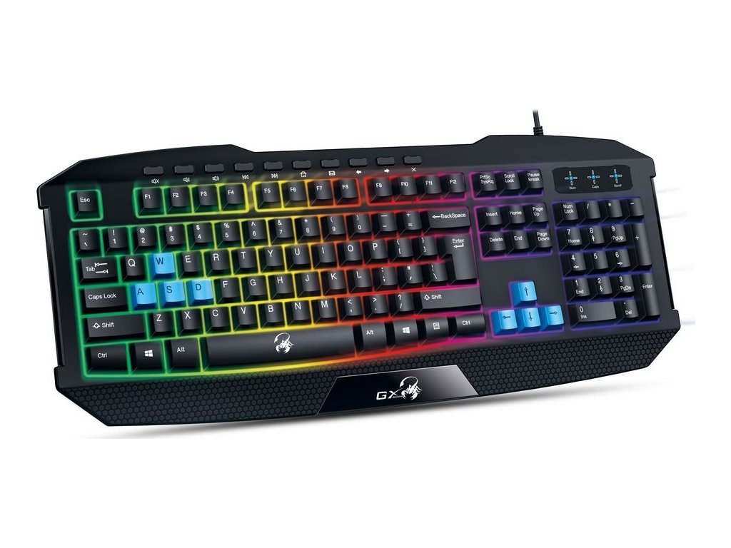 Genius GX GAMING Scorpion K215Herní klávesnice s robustní konstrukcí nabízí duhové podsvícení a povrch odolný proti polití. Rychlé ovládání bez vypadnutí ze hry nebo rozdělané práce zajišťuje 10 multimediálních kláves, například pro přímé ovládání hlasitosti. Připojení lze snadno realizovat pomocí USB kabelu.
