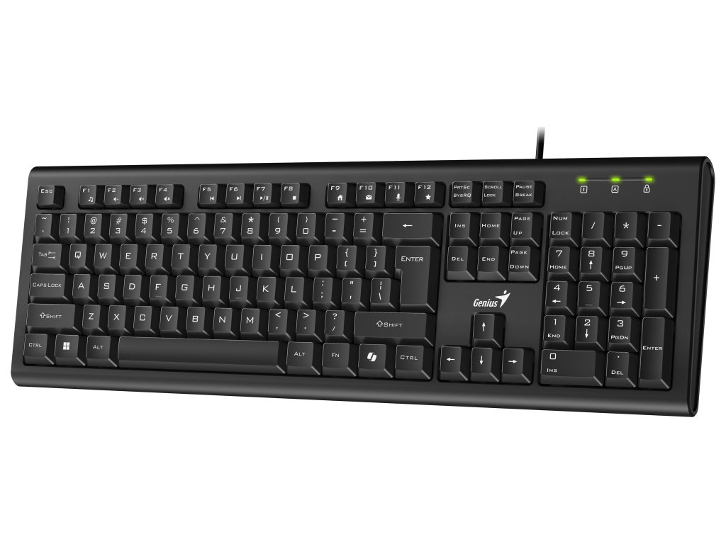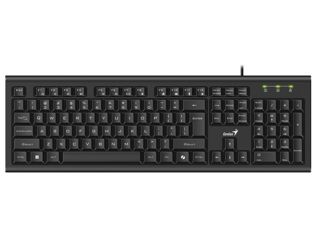 Genius KB-113Klasická drátová klávesnice v černém provedení je určena pro každodenní práci a navržena tak, aby uživateli poskytla maximální komfort. Je vybavena nízkoprofilovými klávesami a samostatnou klávesou pro vyvolání AI asistenta Microsoft Copilot v systému Windows 11. Klávesnice je odolná vůči polití a její připojení k počítači je realizováno skrze USB port.