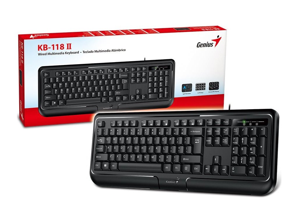 Genius KB-118 IIKlasická drátová klávesnice v černém provedení je určena pro každodenní práci a navržena tak, aby uživateli poskytla maximální komfort. Je vybavena nízkoprofilovými klávesami a opěrkou dlaní. Klávesnice je odolná vůči polití a její připojení k počítači je realizováno skrze PS/2 port.