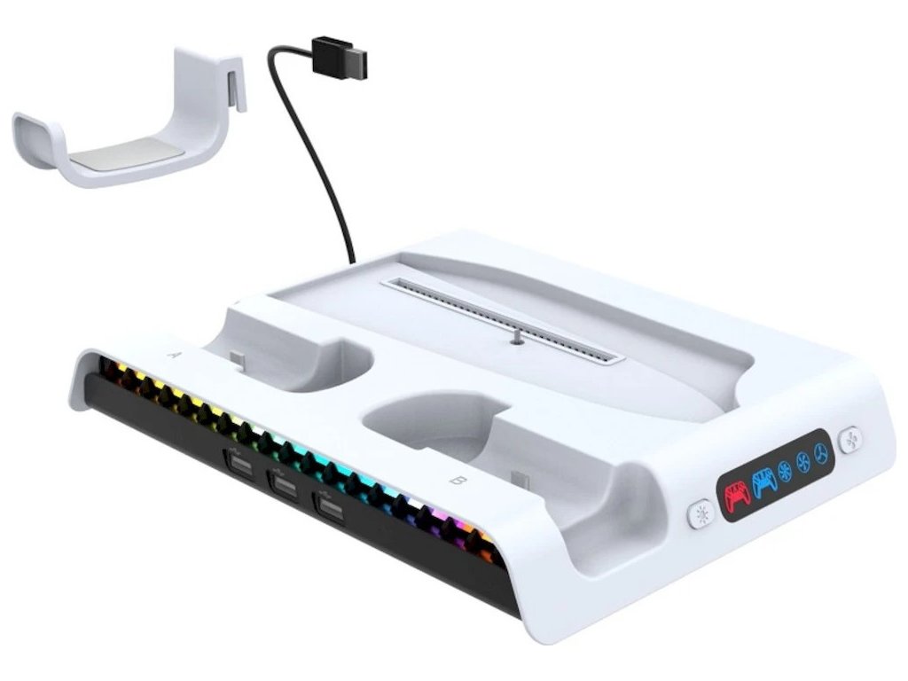 Nabíjecí stanice pro PlayStation 5 Slim s aktivním chlazením, RGB podsvícením, držákem na sluchátka, USB porty a nabíjecími kolébkami pro dva ovladače DualSense. Díky minimalistickému designu, ladící s herní konzolí, doplní váš herní koutek a zajistí vám stálé místo pro odkládání herních ovladačů. Stanice je vybavena stylovým RGB podsvícením, ve kterém se kombinuje 9 barevných odstínů. Podsvícení lze samozřejmě vypnout pomocí tlačítka na dokovací stanici.