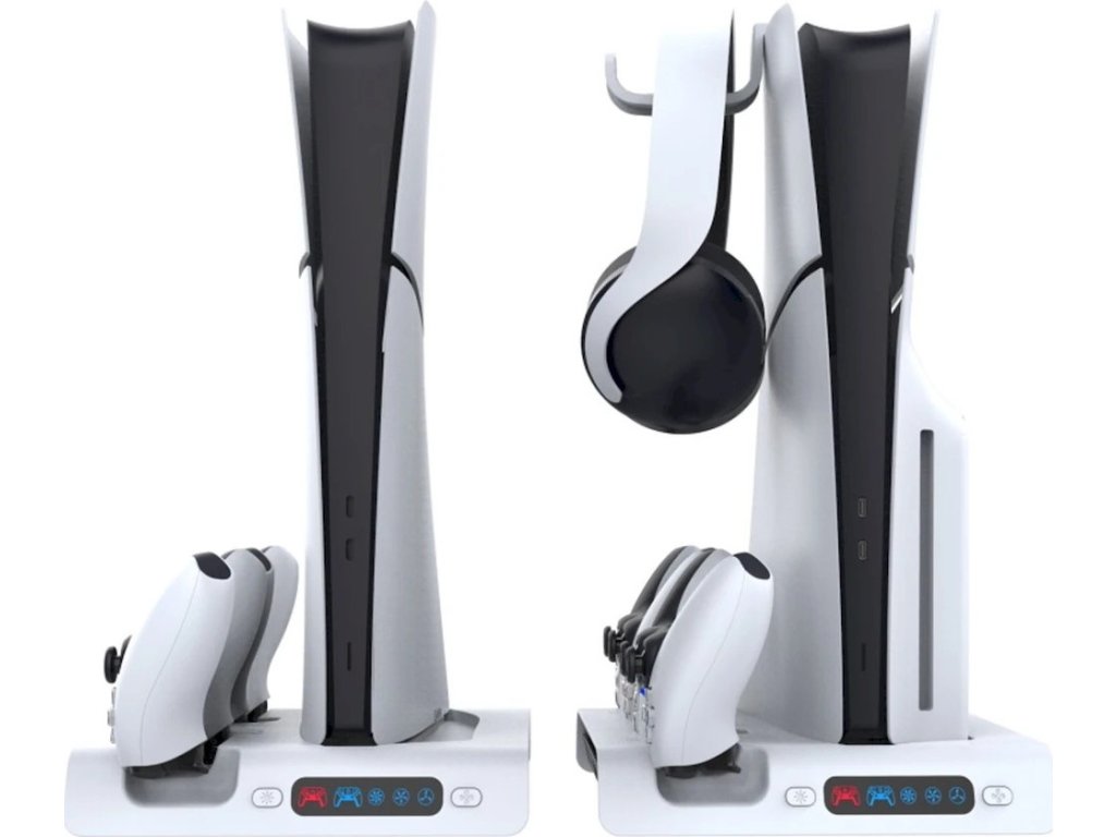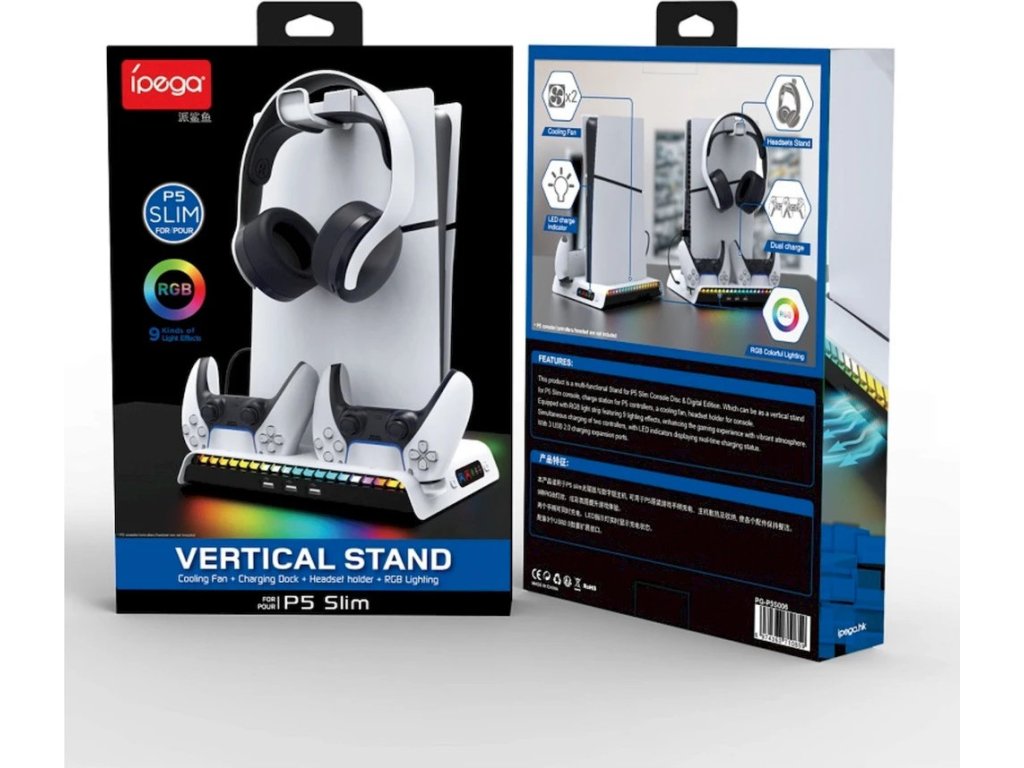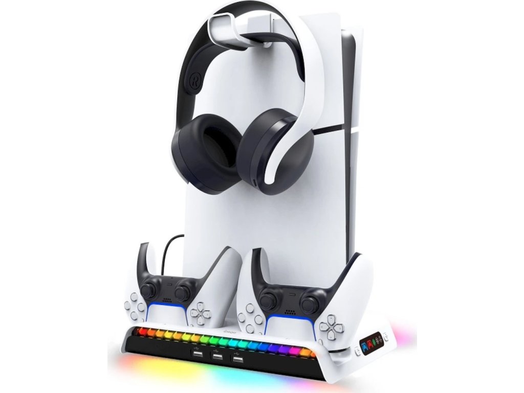 Nabíjecí stanice iPega pro Playstation 5 Slim (CD/Digital) s RGB podsvícením, aktivním chladícím systémem, držákem pro sluchátka a trojicí USB-A portů. Dokáže nabíjet dva DualSense ovladače a díky barevným ikonkám zobrazuje jejich aktuální stav baterie.