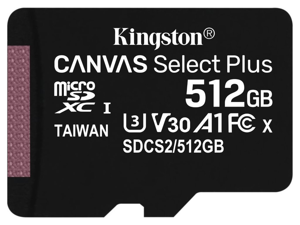 Kingston Canvas Select Plus 512 GBPaměťová karta formátu Micro SDXC nabízí kapacitu 512 GB. Rychlost čtení je až 100 MB/s a rychlost zápisu až 85 MB/s.