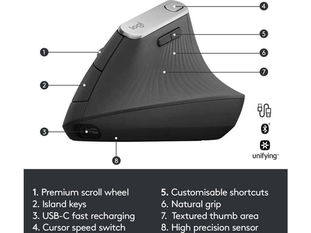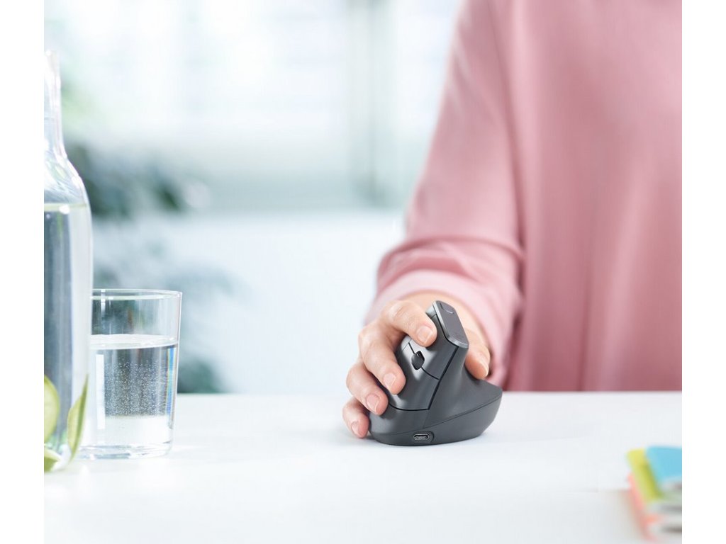 Logitech MX Vertical je ergonomická myš navržená pro maximální pohodlí a snížení svalového zatížení. Vertikální design s úhlem 57° zmírňuje tlak na zápěstí a zlepšuje polohu ruky, což přispívá k delší a pohodlnější práci. Moderní design a vysoká výkonnost dělají z této myši ideální volbu pro zvýšení efektivity. Díky této úpravě dochází ke snížení svalového napětí až o 10 %, což zvyšuje vaši produktivitu. Myš je perfektní volbou pro dlouhodobé používání.