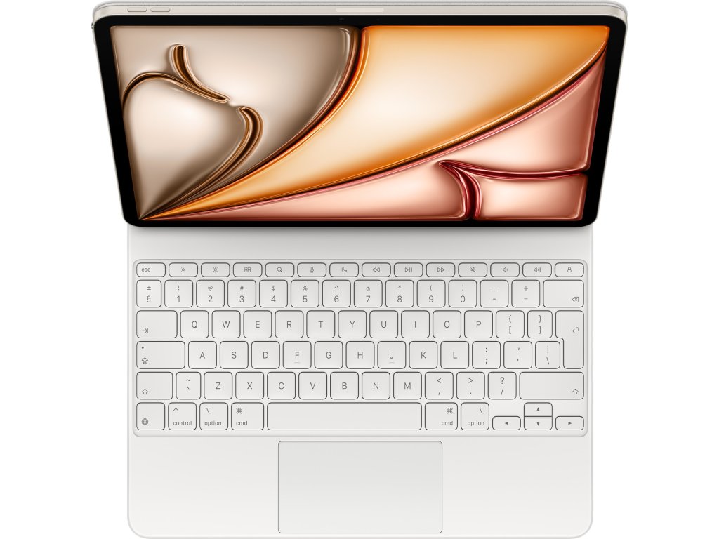 Magic Keyboard je ideální doplněk k iPadu Air. Má elegantní a přenosný design a je na něm radost psát i používat trackpad na přesné ovládání. Nechybí mu řádek 14 funkčních kláves ani USB-C konektor na průchozí nabíjení. Navíc chrání iPad zepředu i zezadu. Plovoucí konzolová konstrukce se dá plynule přizpůsobit do různých pozorovacích úhlů a velký skleněný trackpad rozšiřuje možnosti práce s iPadOS.