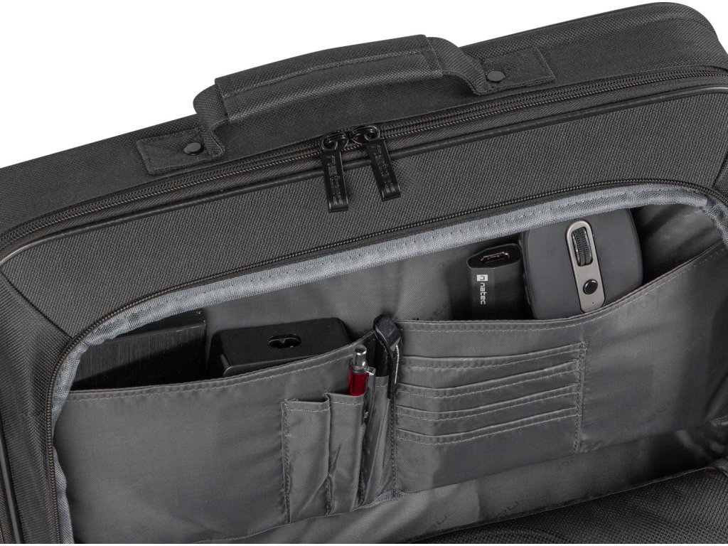 Pokud používáte další příslušenství, Natec Boxer Lite 15,6" vám ho umožní vzít s sebou. Do kapes umístěných v přední přihrádce se snadno vejde oblíbená myš, multiport, přenosný pevný disk nebo powerbanka. Propisky a vizitky můžete uložit do speciálního organizéru. Uvnitř najdete také speciální kapsu na kabely a nabíječku. V brašně Natec Boxer Lite 15,6" má vše své místo.