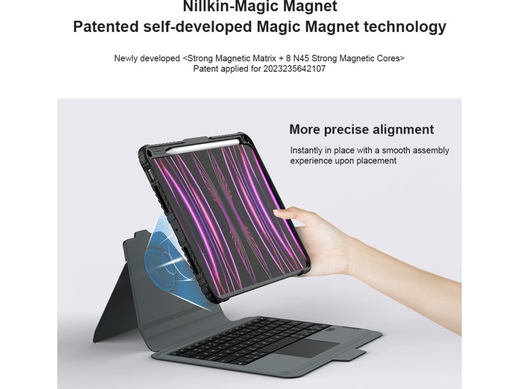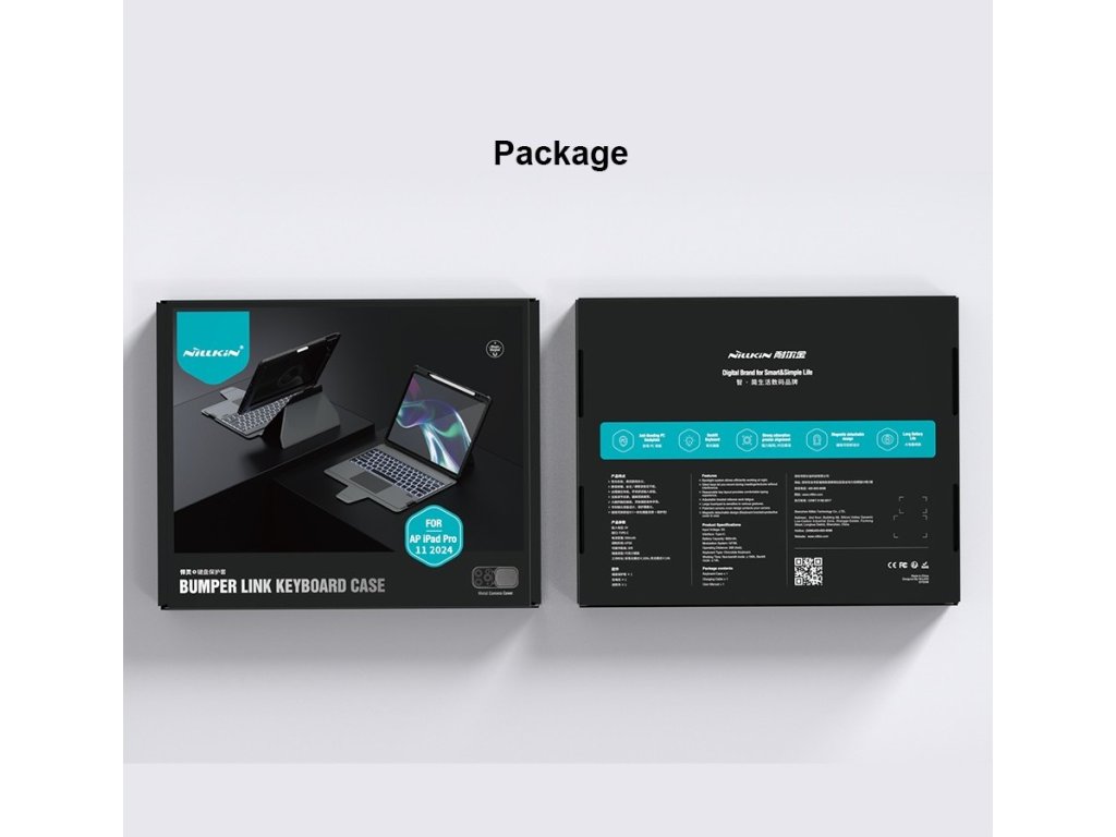 Nillkin Bumper Link Keyboard Case je víceúčelový ochranný kryt tabletu s odnímatelnou podsvícenou klávesnicí, slotem pro Apple Pencil a plynule nastavitelným úhlem tabletu.