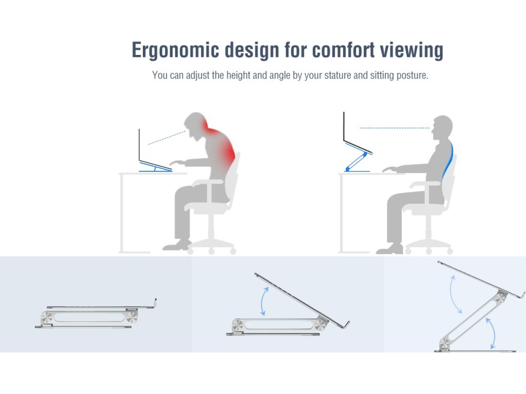 Pomocí stojánku si umístíte svůj notebook na stůl do libovolné pozice. Ať už používáte samotný notebook nebo slouží jako druhý monitor, tento stojánek vám umožní nastavit přesně tu pozici, kterou potřebujete.