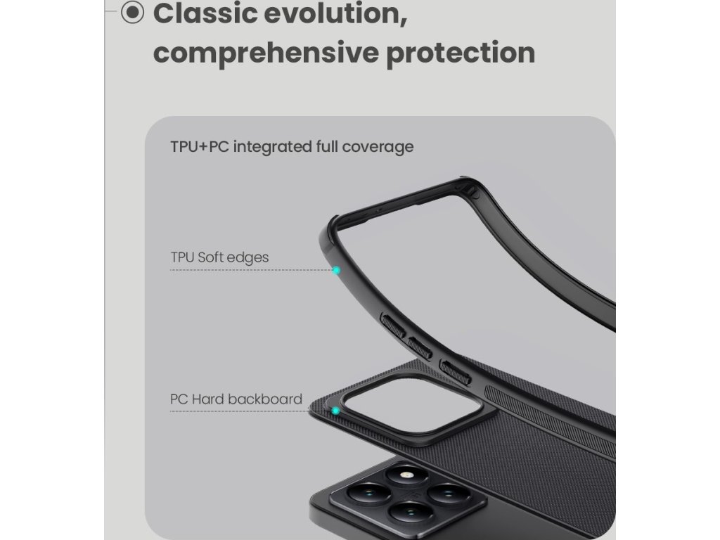 Skládá se z tvrdého a odolného plastu na zadní straně a TPU měkkého plastu na bocích.
