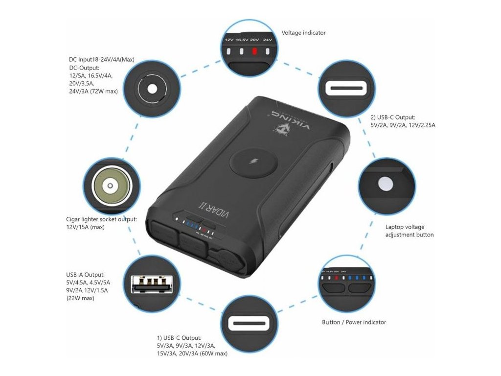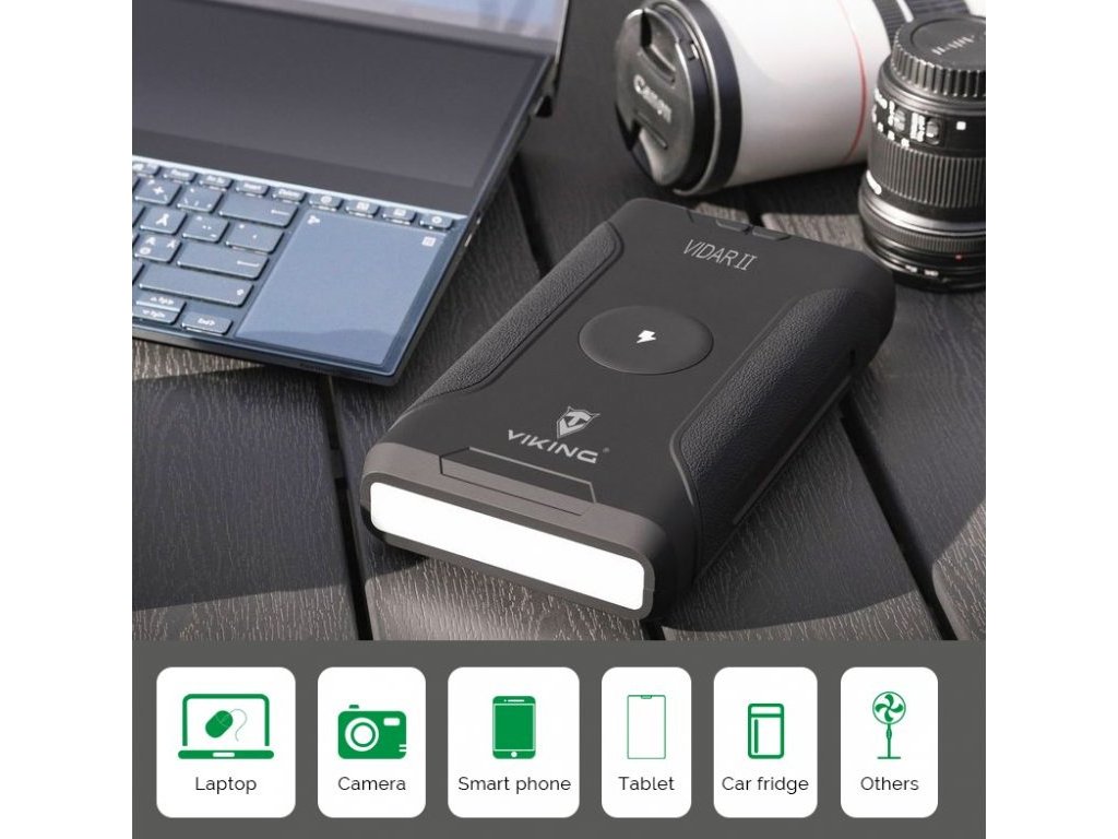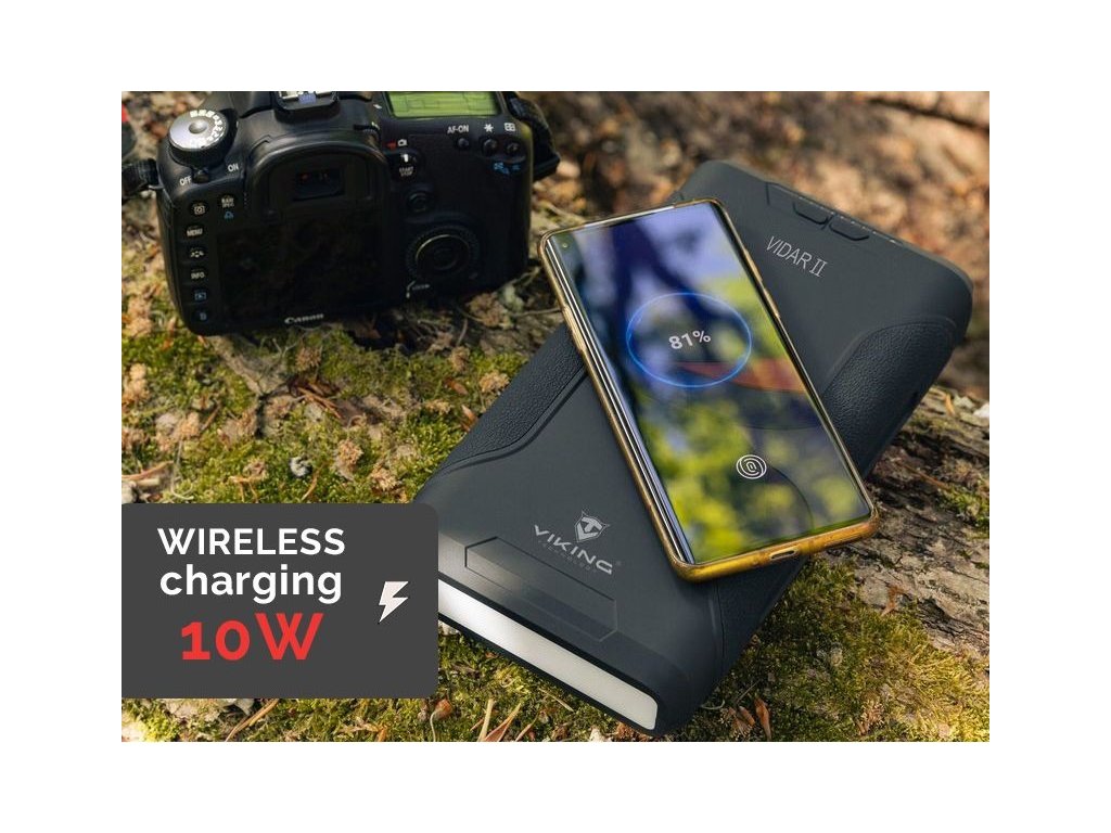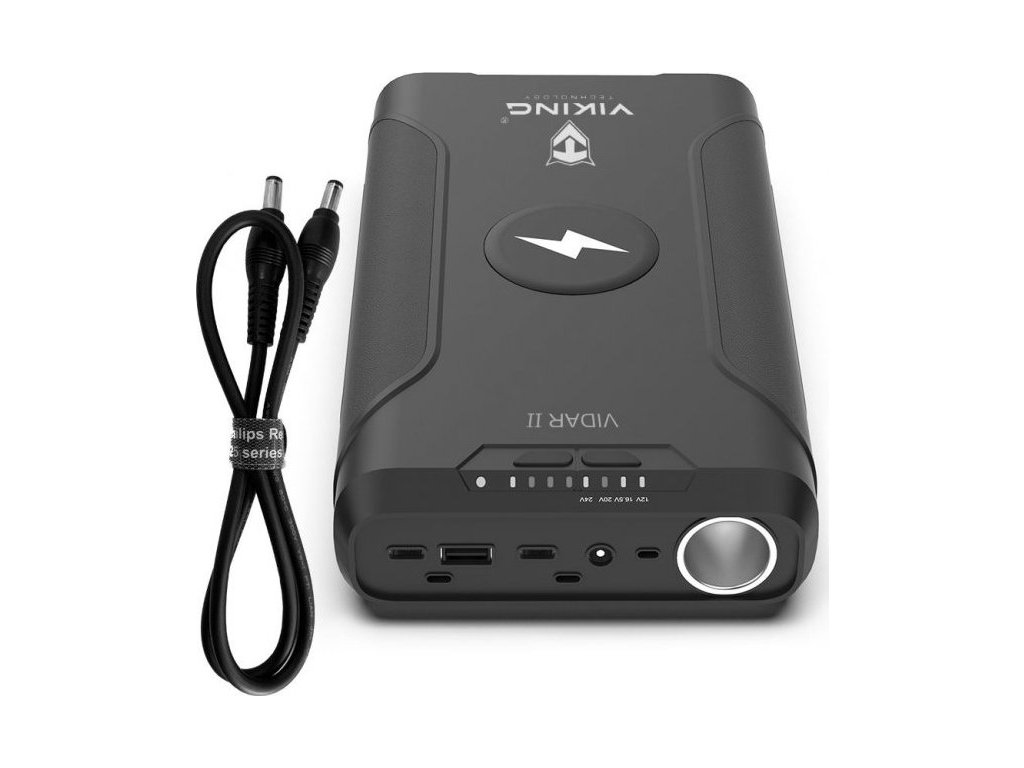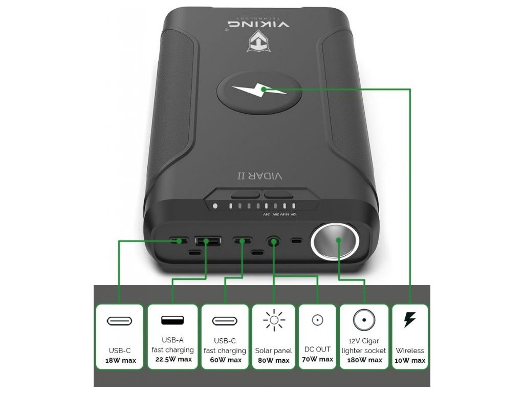 USB-C i USB-A výstupy jsou ideální pro rychlé nabíjení moderních zařízení díky podpoře PD a QC protokolu (až 60W). Cigaretovou zásuvku oceníte při použití přenosných elektronických zařízení ve vozidle a DC jack je praktický pro nabíjení notebooků. Powerbanka Viking VIDAR II je také vybavena bezdrátovým nabíjením o výkonu 10W. Stačí umístit kompatibilní zařízení na vrchní část powerbanky a bezdrátové nabíjení se automaticky spustí.