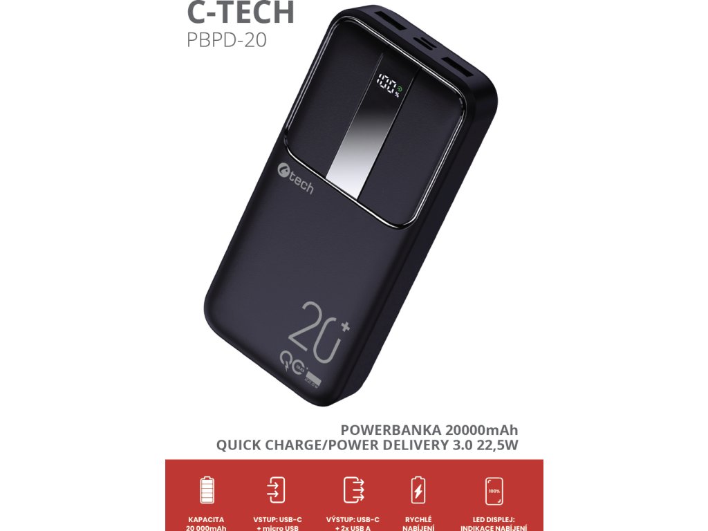 Powerbanka C-tech 20000mAh, Li-Pol, 22,5W, USB-C/USB-A/micro USB