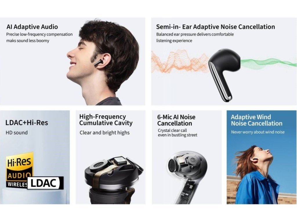 Po zapnutí ANC se bezdrátová sluchátka automaticky přizpůsobí vašemu zvukovodu, dynamicky detekují změny okolního hluku a stavu nošení a dynamicky upravují a přizpůsobují nejvhodnější parametry potlačení hluku v reálném čase, čímž zajistí, že okolní hluk je účinně eliminován. Konstrukce také zahrnuje vodotěsnou a adaptivní strukturu proti větru IPX5, takže jsou ideální pro outdoorové aktivity.