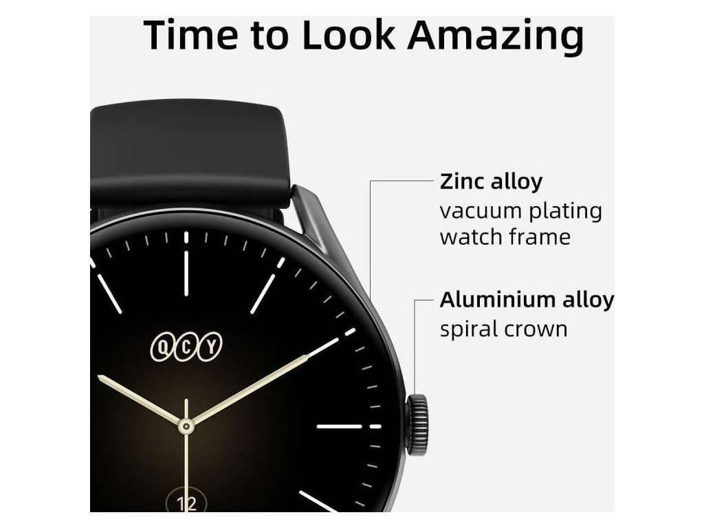 Hodinky QCY Watch GT s úžasným aerodynamickým tělem využívají rám hodinek s vakuovým pokovováním ze slitiny zinku a korunku z hliníkové slitiny k podtržení struktury kovu.