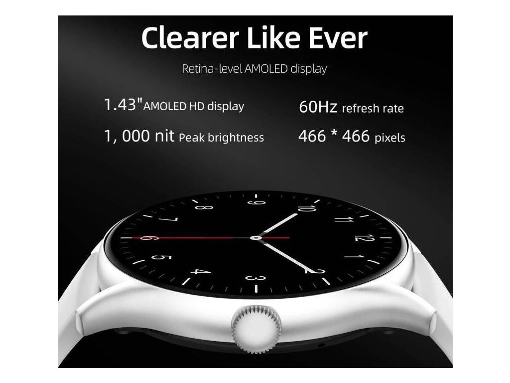 Displej: 1,43" dotykový AMOLED, rozlišení 466 x 466, obnovovací frekvence 60 Hz