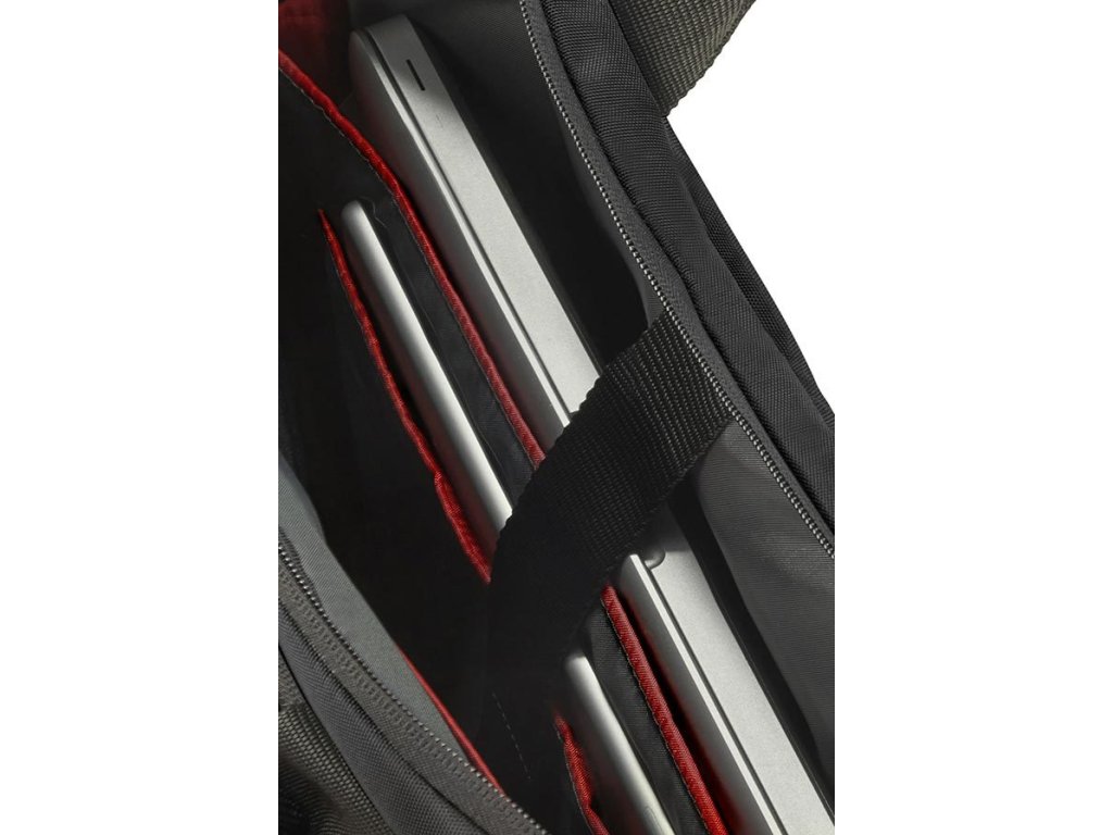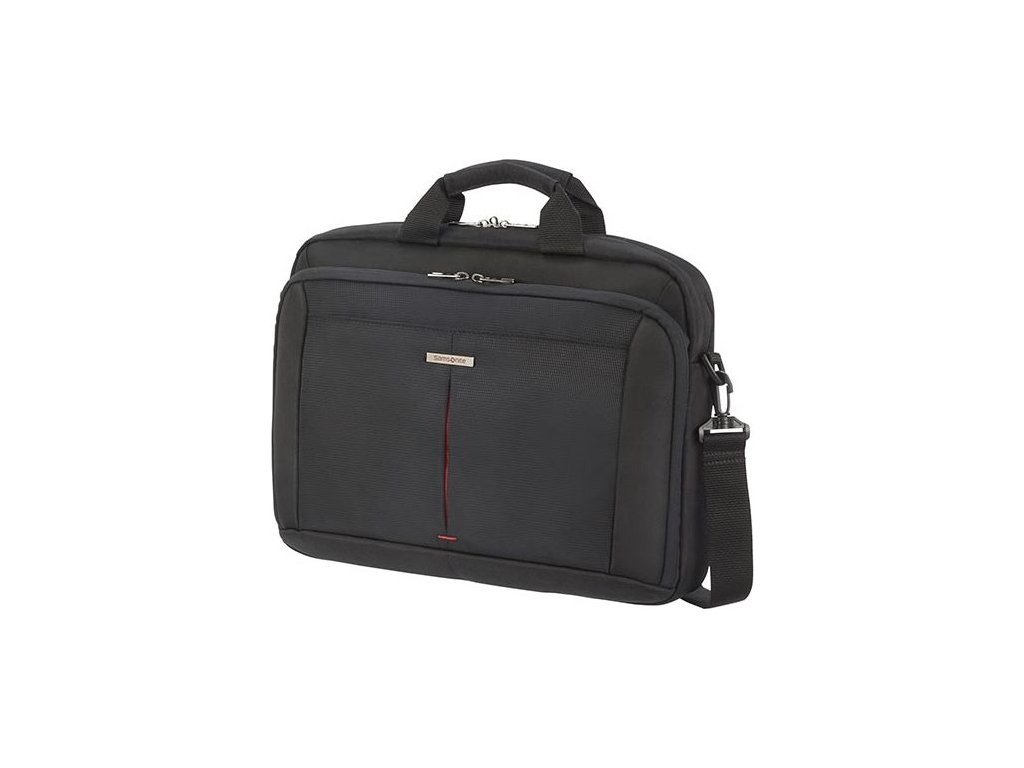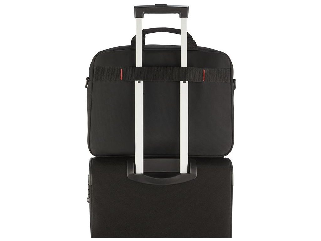 Brašna na notebook Samsonite Bailhandle 15,6" z kolekce Guardit 2 má z přední strany dvě samostatné kapsy na zip, z toho jednu s organizérem. V hlavní části je polstrovaná přihrádka na notebook s páskem na připevnění, přihrádka na tablet a kapsa např. na dokumenty (A4). Brašna má nastavitelný odnímatelný popruh na rameno a navlékací pásek sloužící ke snadnému připevnění na rukojeť kufru.