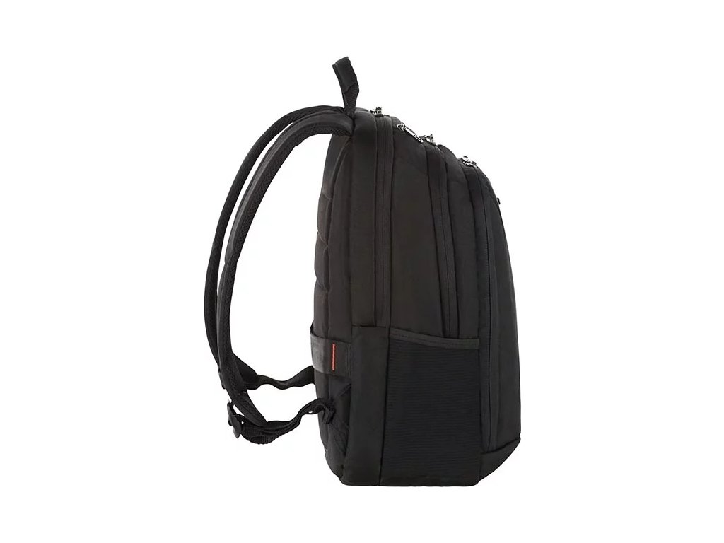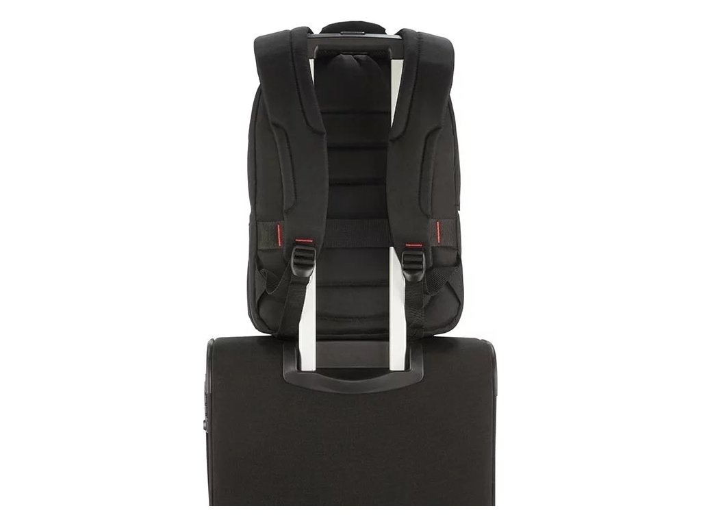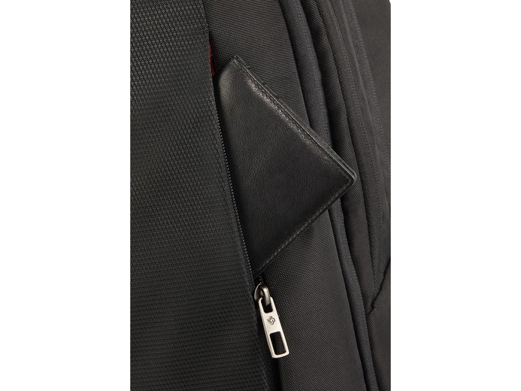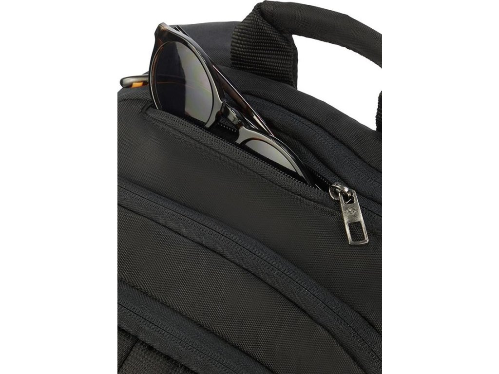 Batoh na notebook Samsonite LAPT. BACKPACK S 14,1" je rozdělen do tří částí. V první části je organizér + dvě vetší kapsy, ve druhé je kapsa na zip, kapsa na dokumenty + volný prostor. Ve třetí části je polstrování na uložení notebooku a přihrádka na tablet. Batoh má ochranné zádové polstrování, nastavitelné zádové popruhy a tzv. návlekový pásek sloužící k připevnění na rukojeť kufru.