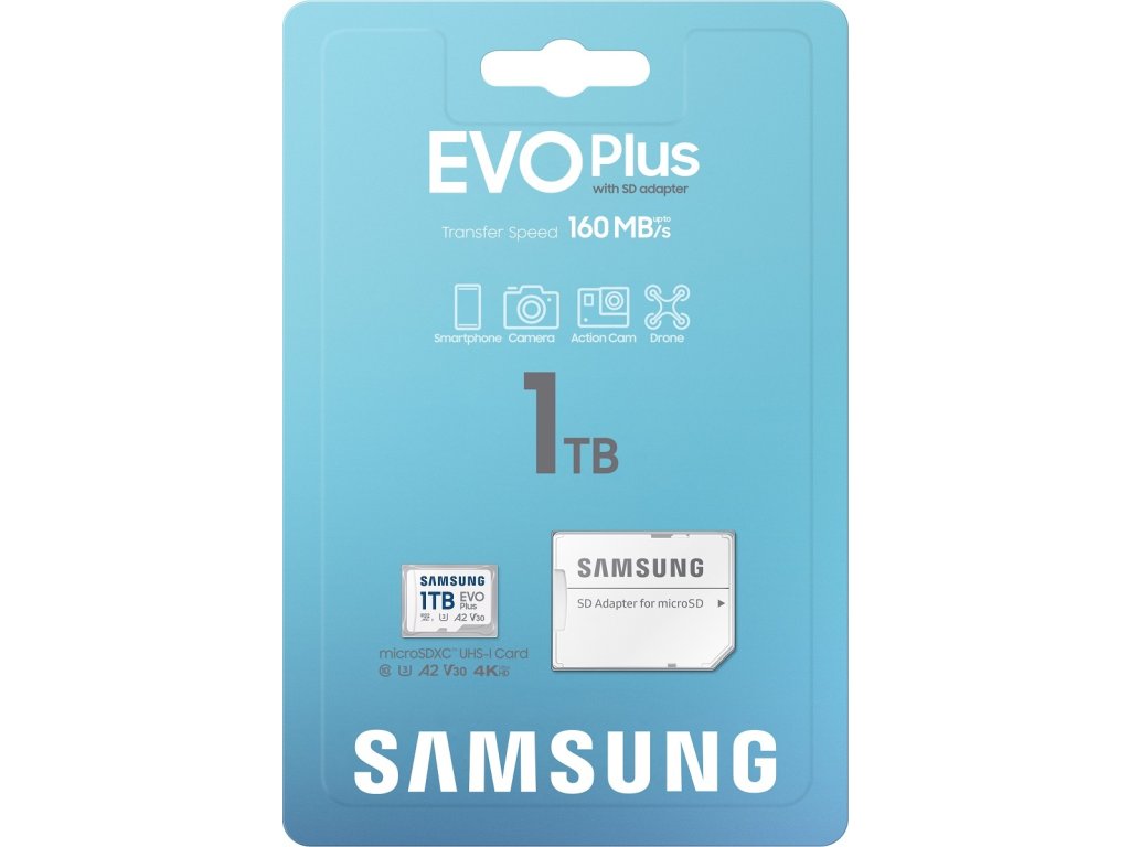 Samsung EVO Plus Micro SDXC 1 TBPaměťová karta formátu Micro SDXC nabízí kapacitu 1 TB. Rychlost čtení je až 160 MB/s. Samozřejmostí je pak odolnost vůči vodě, nárazům, extrémním teplotám, magnetům i rentgenovému záření. Součástí balení je SD adaptér.