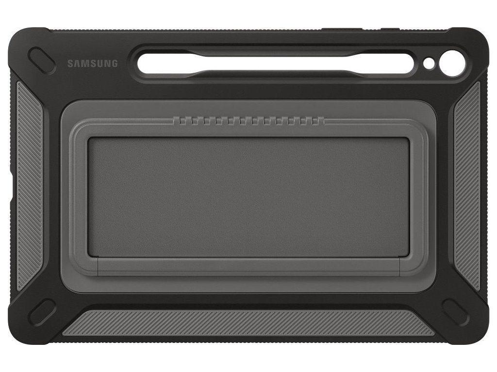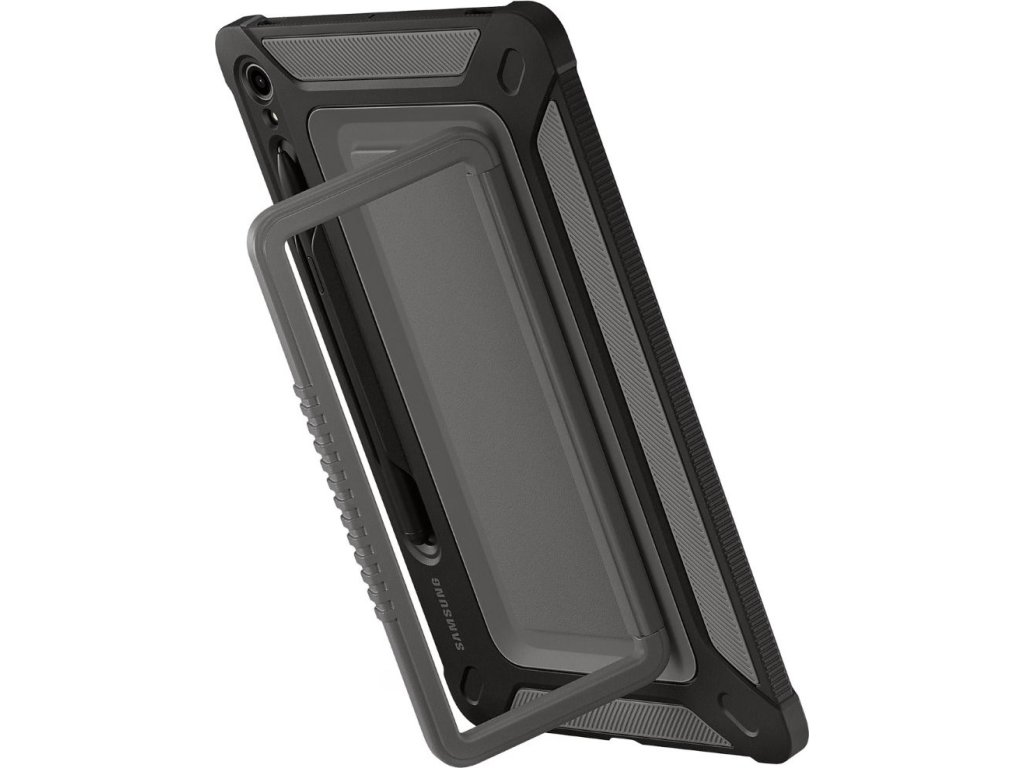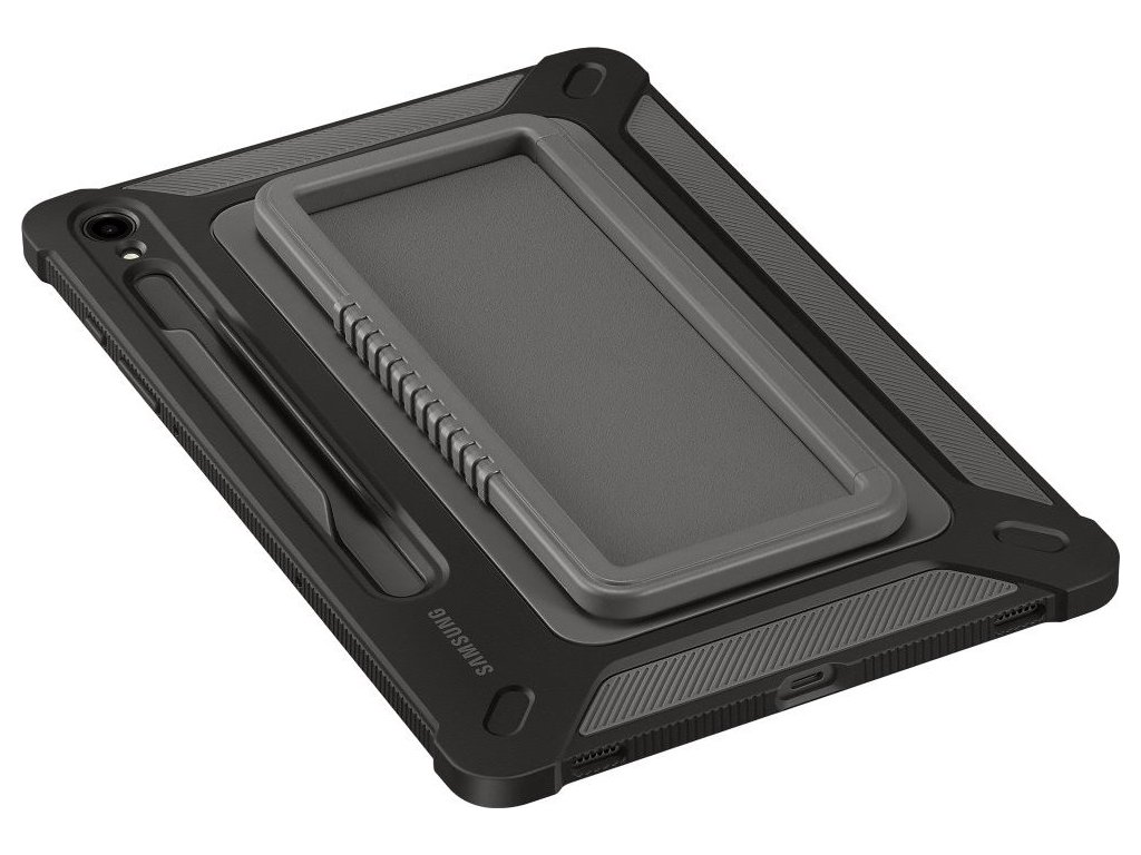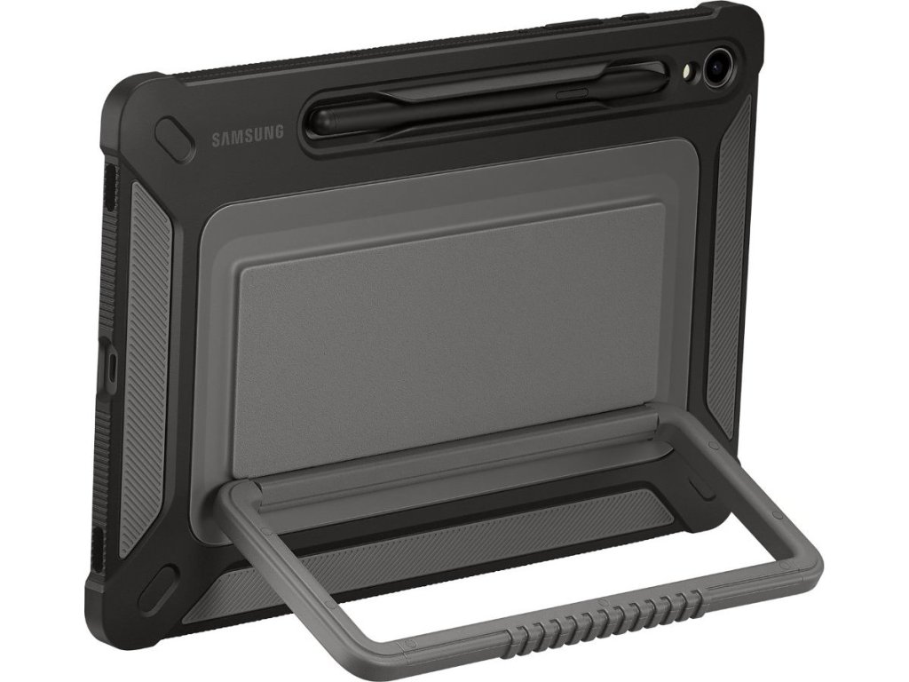 Samsung Outdoor Cover pro Galaxy Tab S9Ochranný kryt s odolností na úrovni vojenského standardu MIL-STD 810G-516.7 spolehlivě ochrání tablet před pády a nárazy. Disponuje praktickým stojánkem pro pohodlnější psaní, surfování nebo sledování médií. Stojánek navíc slouží také jako rukojeť pro bezpečné přenášení. Zabudovaný držák dotykového pera S Pen je praktický doplněk, díky kterému může být stylus snadno dostupný a vždy po ruce.
