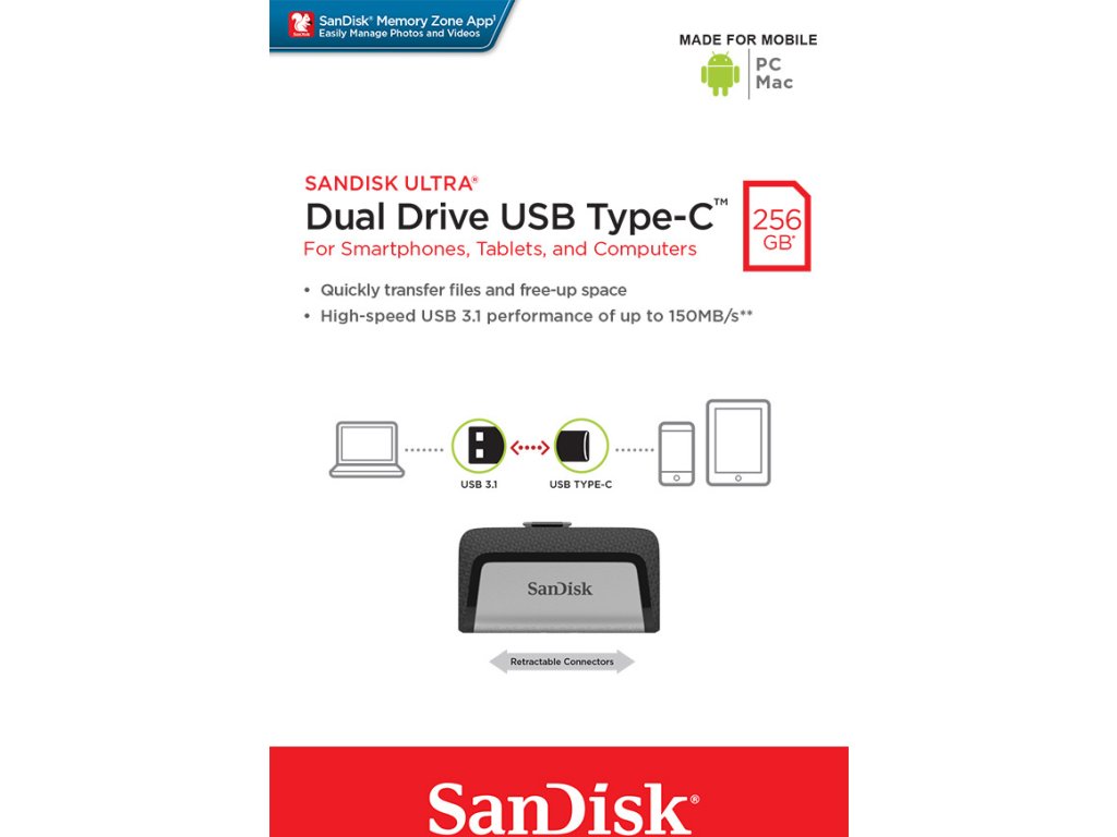 SanDisk Ultra Dual USB-C 256 GBFlashdisk s rozhraním USB 3.0. Nabízí kapacitu 256 GB a rychlost čtení až 150 MB/s. Flashdisk je vybaven dvěma výsuvnými konektory USB 3.0 a USB-C.