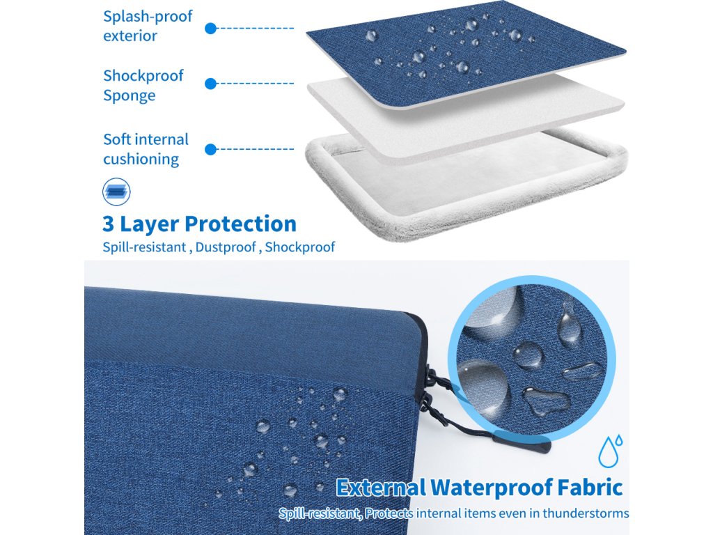Taška je vyrobena ze tří vrstev textilie - vnější voděodolný materiál, střední nárazu vzdorný materiál a vnitřní měkký materiál. Díky těmto třem textiliím máte jistotu, že je vaše zařízení v bezpečí za všechn okolností. Rohy brašny jsou navíc opatřeny ochranou rohů zařízení.