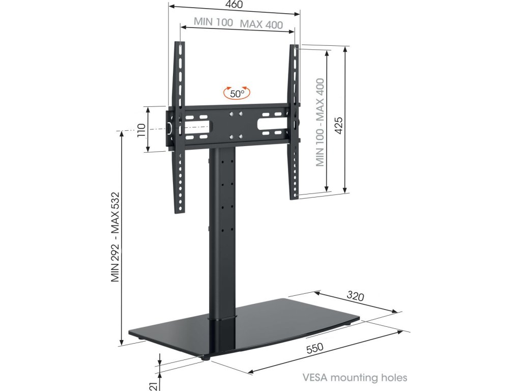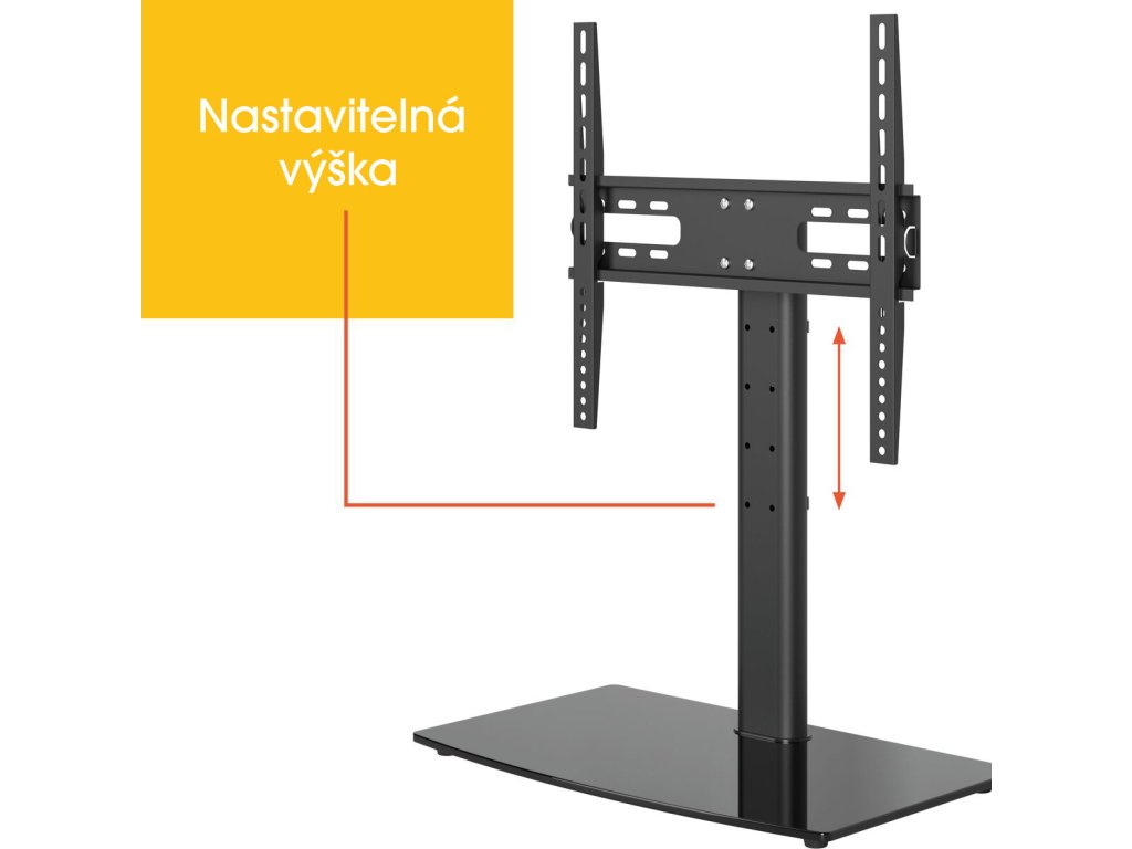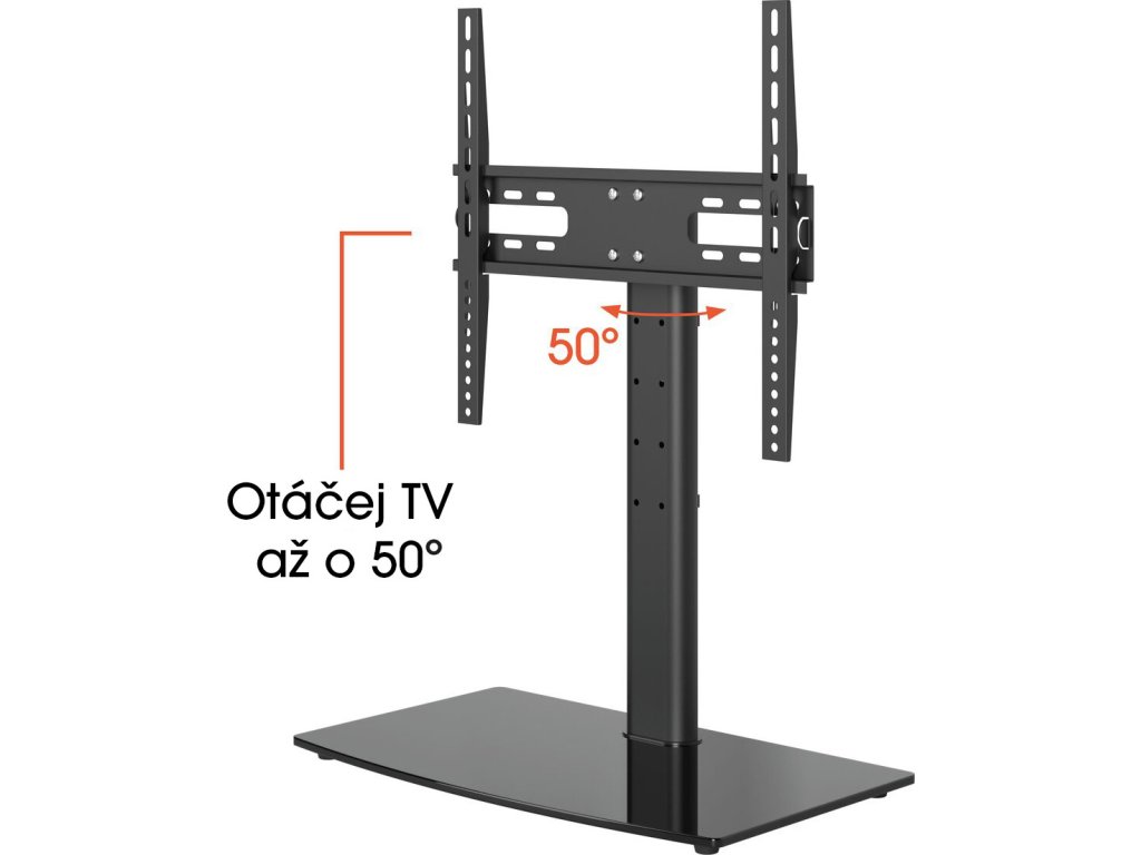 Díky základové desce o rozměrech 55 x 32 cm nepotřebujete tak širokou televizní skříňku jako u běžných televizních podstavců. Základní deska je vyrobena z tvrzeného skla a zajišťuje mimořádnou stabilitu televizoru. Při instalaci si sami zvolíte výšku, ve které chcete televizor namontovat. Televizor můžete snadno natočit až o 50° směrem na své oblíbené křeslo.