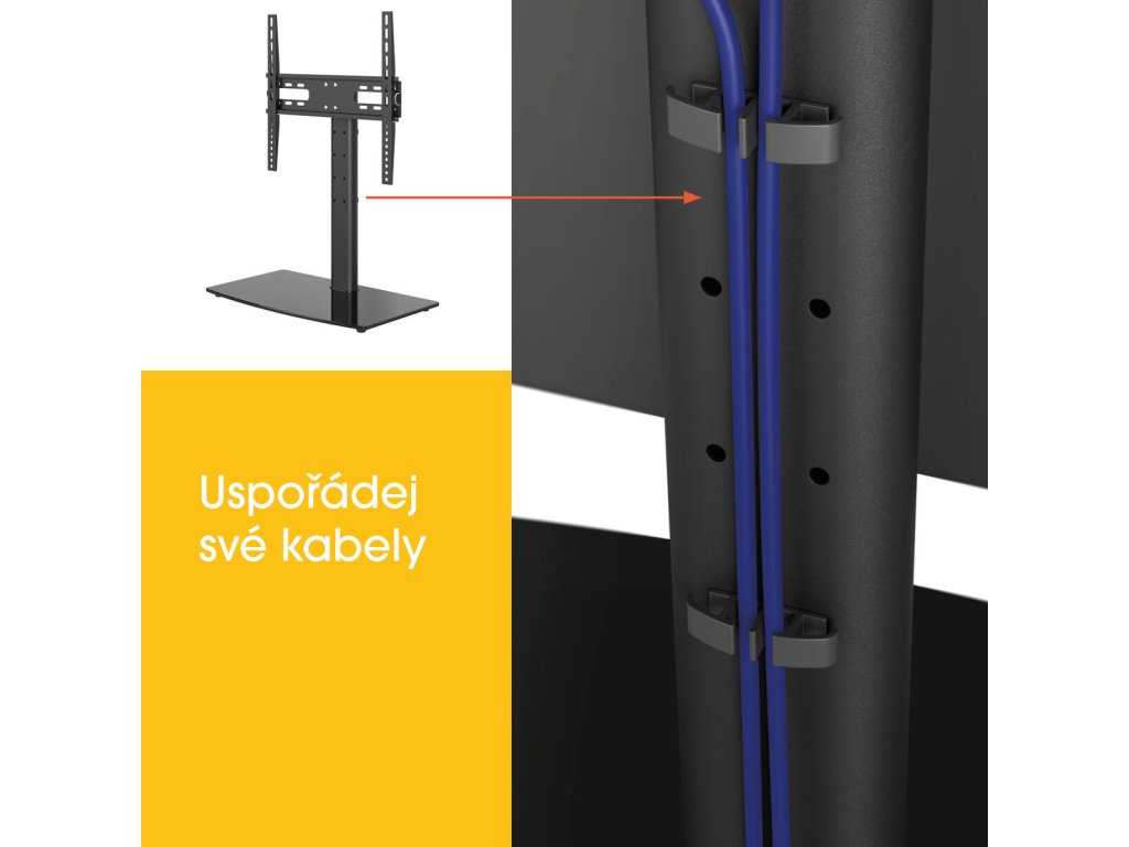 Pomocí praktických sponek na kabely, které jsou součástí balení, připnete kabely k zadní straně stojanu, takže vzhled stojanu zůstane čistý a upravený.