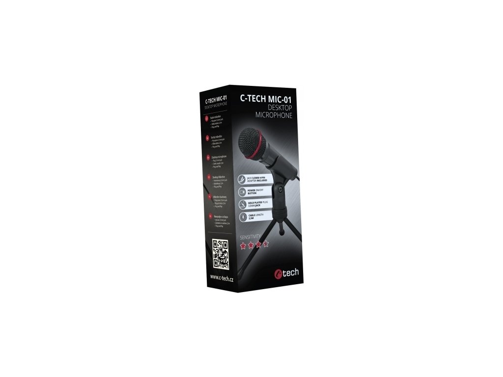 C-TECH MIC-01 je kvalitní mikrofon s přirozenou kvalitou reprodukce hlasu pro každodenní použití. Své uplatnění najde jak při použití s komunikačními programy, tak i při vytváření youtube videí nebo live přenosů. Mikrofon se připojuje pomocí 2,5m kabelu s pozlaceným stereo konektorem jack 3,5mm, v balení však naleznete i redukci jack stereo 3-pin/4-pin pro připojení mikrofonu k zařízení, které je vybaveno sloučeným audio konektorem pro mikrof a sluchátka. Mikrofon je vybaven zapínacím tlačítkem ON/OFF. V balení naleznete praktický podstavec (tripod), díky kterému lze umístit mikrofon do různých poloh.