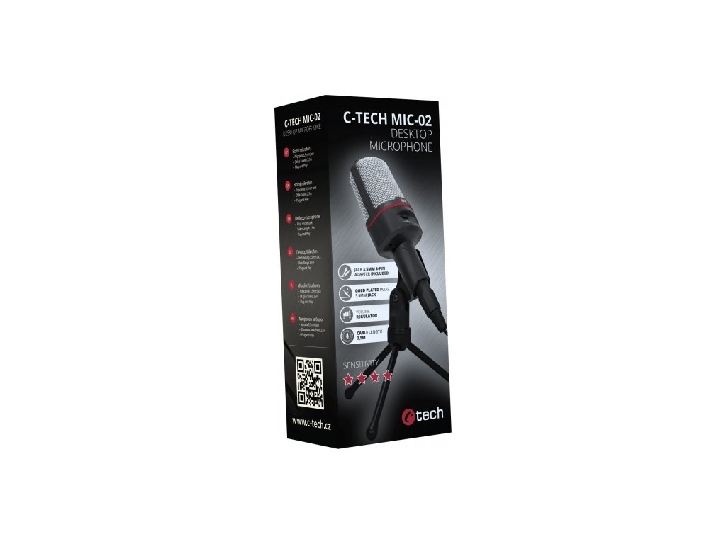 C-TECH MIC-02 je vysoce kvalitní mikrofon s přirozenou kvalitou reprodukce hlasu pro každodenní použití. Své uplatnění najde jak při použití s komunikačními programy, tak i při vytváření youtube videí nebo live přenosů. Mikrofon se připojuje pomocí 2,5m kabelu s pozlaceným stereo konektorem jack 3,5mm, v balení však naleznete i redukci jack stereo 3-pin/4-pin pro připojení mikrofonu k zařízení, které je vybaveno sloučeným audio konektorem pro mikrof a sluchátka. Mikrofon je vybaven zapínacím tlačítkem s regulací hlastitosti. V balení naleznete praktický podstavec (tripod), díky kterému lze umístit mikrofon do různých poloh.