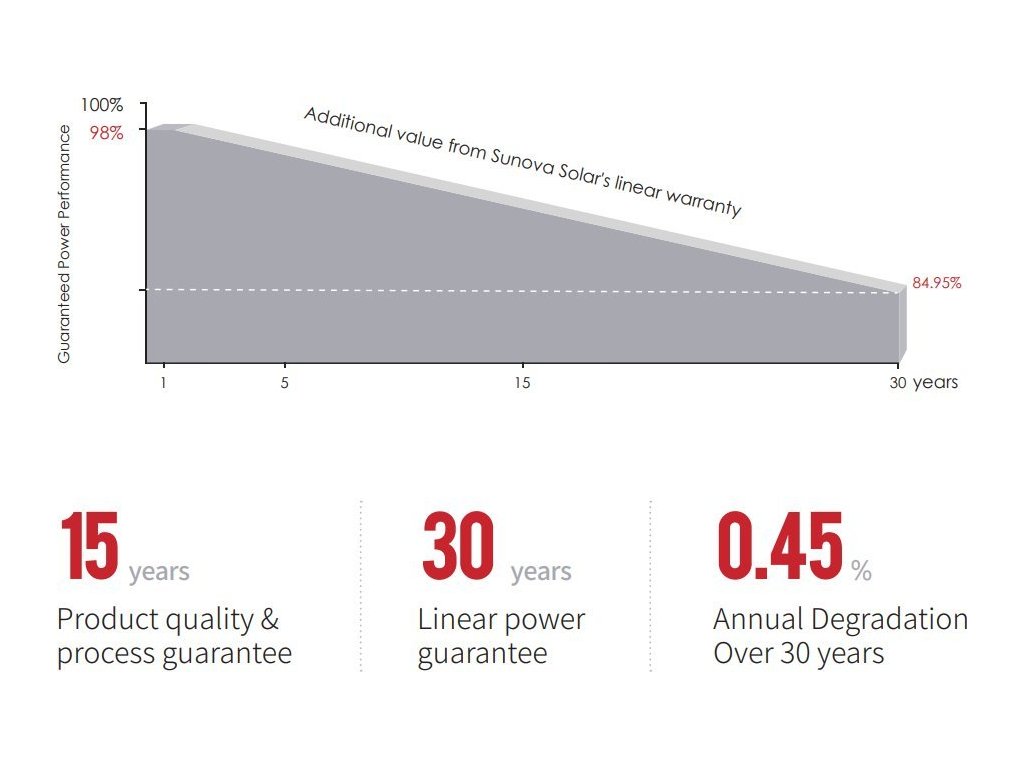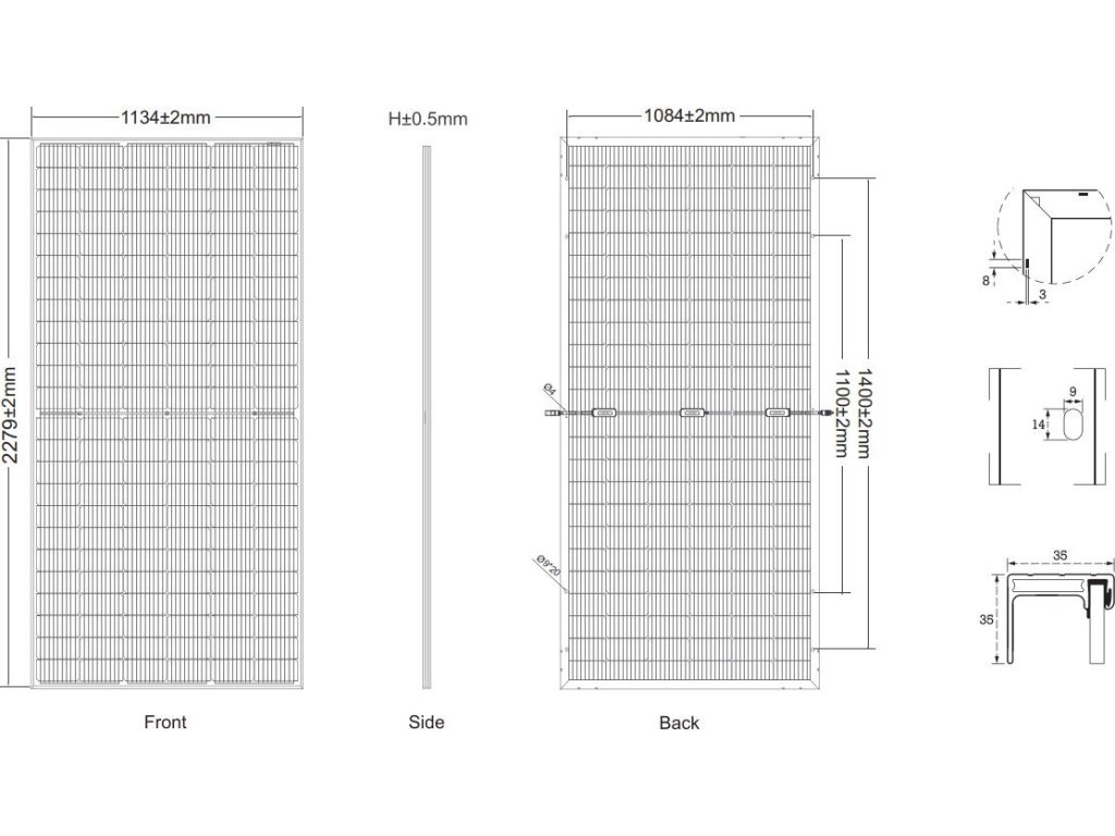 Bifaciální solární panel značky Sunova Solar s nominálním výstupním výkonem 550 W je složen celkově ze 144 monokrystalických OBOUSTRANNÝCH článků a pevné hliníkové konstrukce stříbrné barvy. Panel má na zadní straně pro připojení do měniče nebo vedlejšího panelu 2 výstupní kabely s MC4 konektory, které jsou dlouhé 1,2 m, což je vhodné pro spojení panelů s vertikální i horizontální orientací. Celkové rozměry panelu jsou 2279 x 1134 x 35 mm, hmotnost 32,3 kg a účinnost 21.3 %, což je dáno sběrem energie z obou stran.