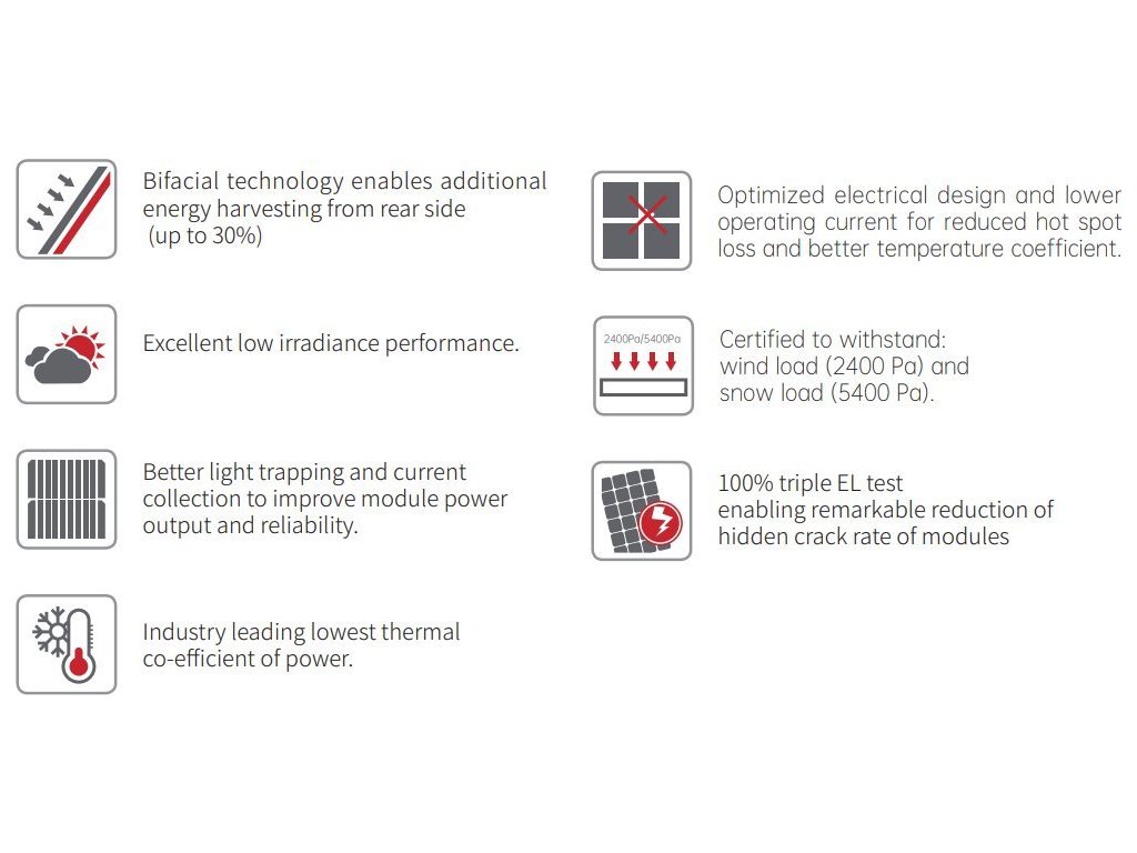 - Bifaciální technologie umožňuje získávání další energie ze zadní strany (až 30 %)