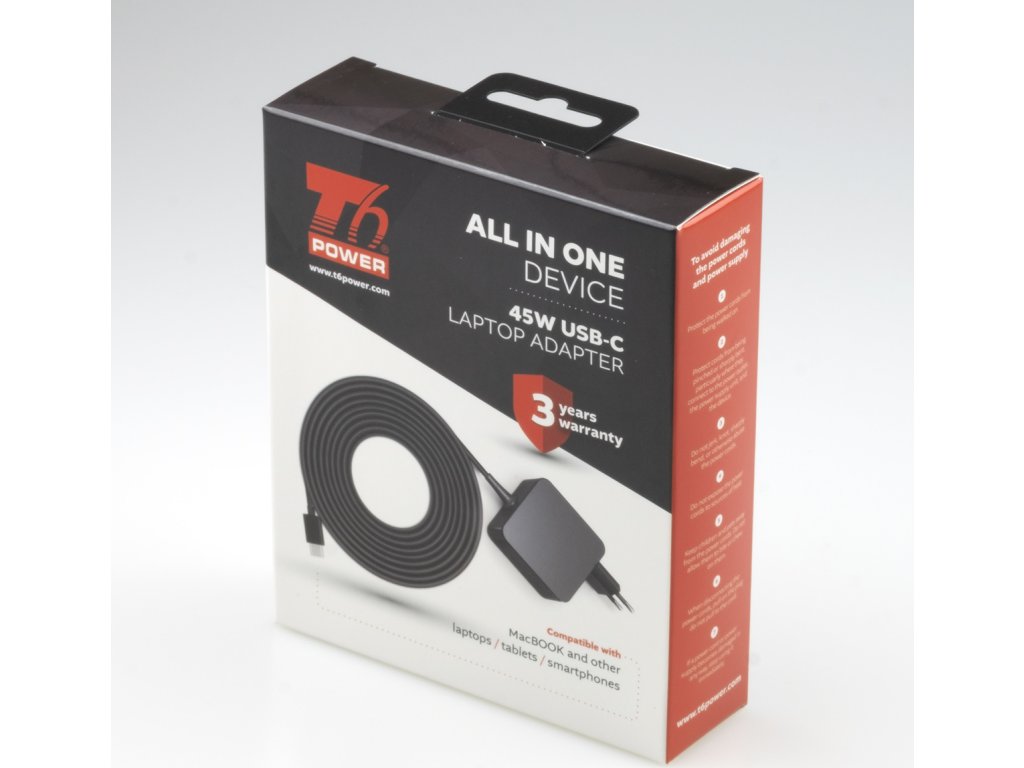 Univerzální adaptér značky T6 Power s výkonem 45 W je ideálním zdrojem energie pro notebooky, ultrabooky, MacBooky, tablety, mobílní telefony, monitory, atd.
