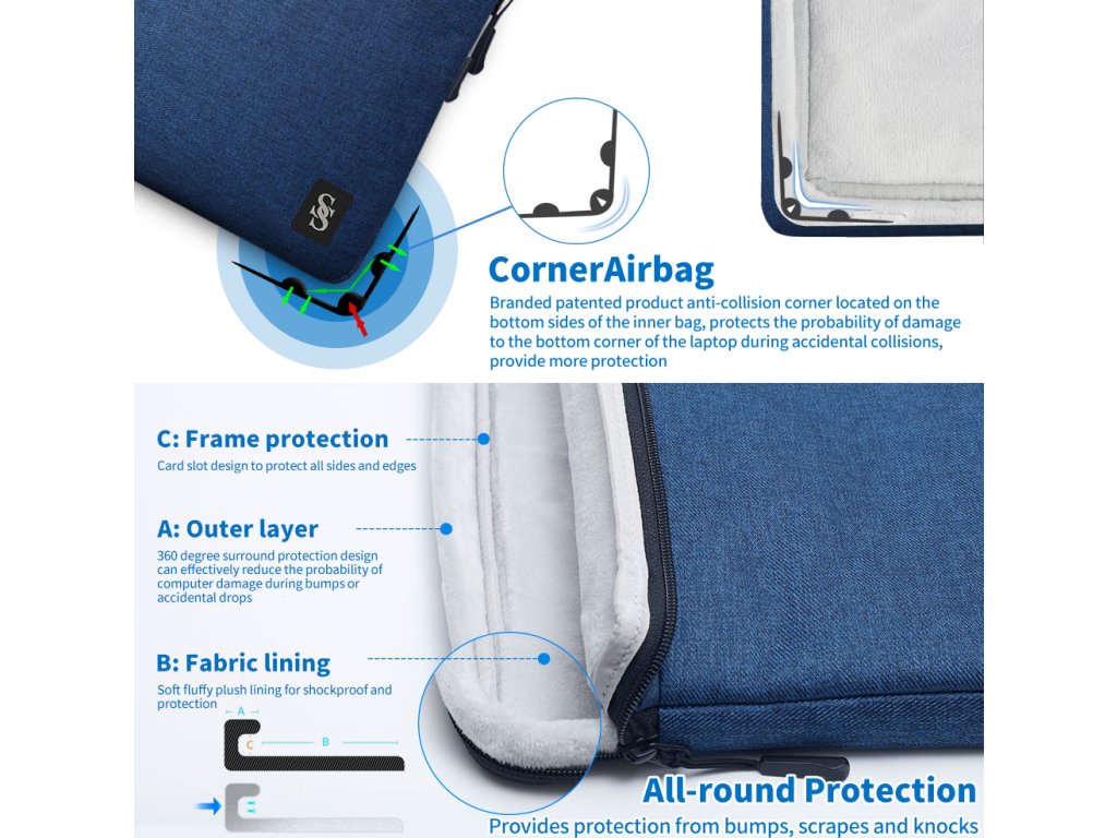 Taška je vyrobena ze tří vrstev textilie - vnější voděodolný materiál, střední nárazu vzdorný materiál a vnitřní měkký materiál. Díky těmto třem textiliím máte jistotu, že je vaše zařízení v bezpečí za všechn okolností. Rohy brašny jsou navíc opatřeny ochranou rohů zařízení.
